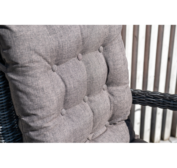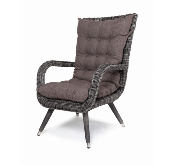 Садовое кресло дополнено мягкими подушками для комфортного размещения. Они выполнены в сером цвете. При их пошиве используется полиэстер с плотностью 300гр/м2. Влагоотталкивающая пропитка усиливает защитные свойства материала.