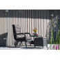 Размер модели – 690×810×990 мм. При изготовлении ее каркаса используется прочный алюминий с высокой износостойкостью. Имеет ручное плетение, которое выполнено из искусственного ротанга в цвете графит.