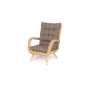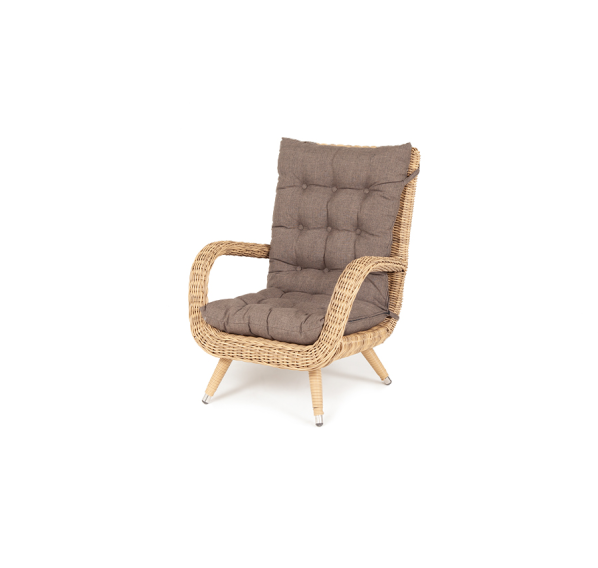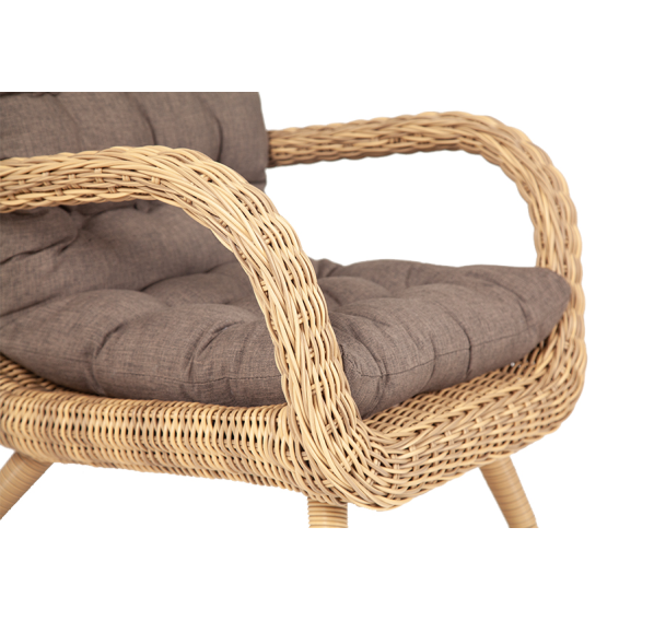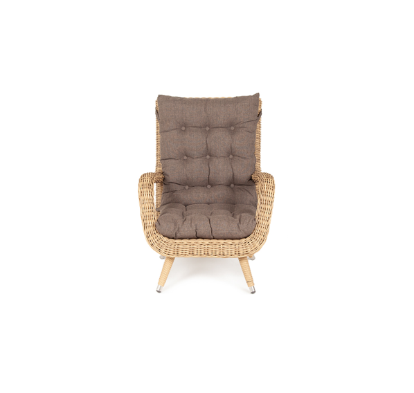 Размер модели – 690×810×990 мм. При изготовлении ее каркаса используется прочный алюминий с высокой износостойкостью. Имеет ручное плетение, которое выполнено из искусственного ротанга. Представлена в натуральном соломенном цвете.