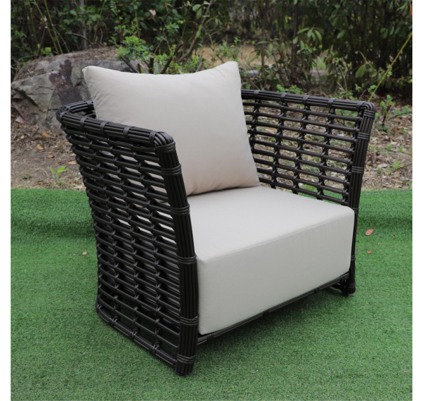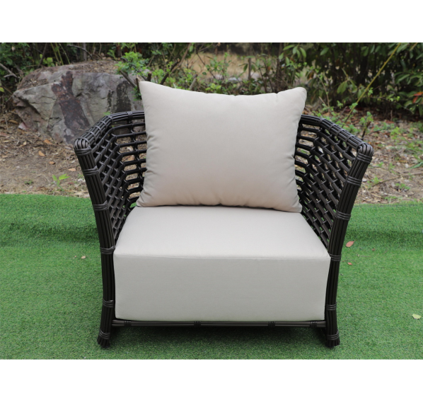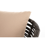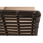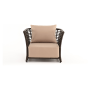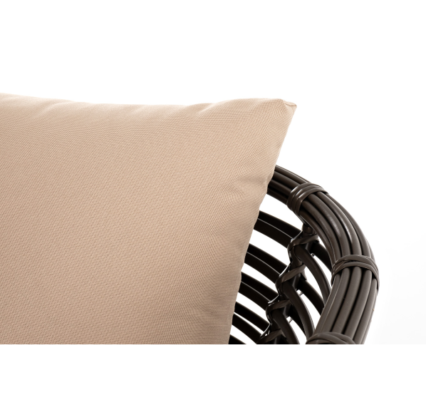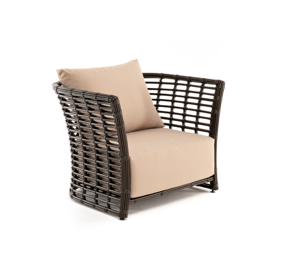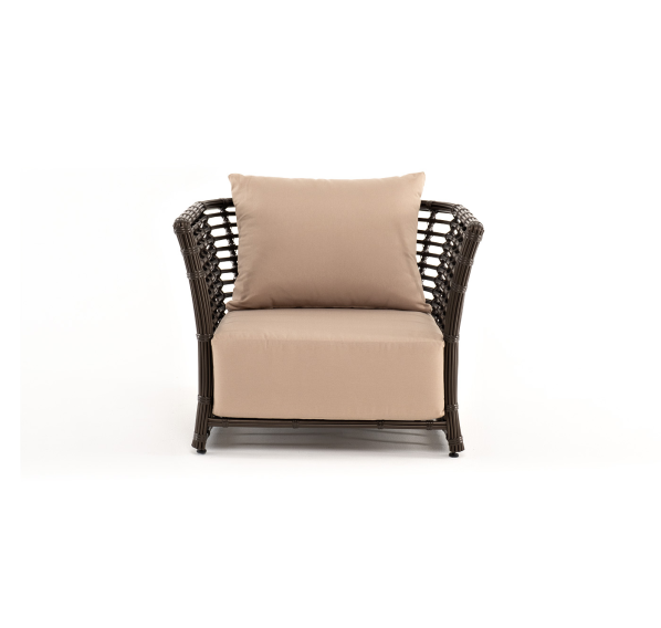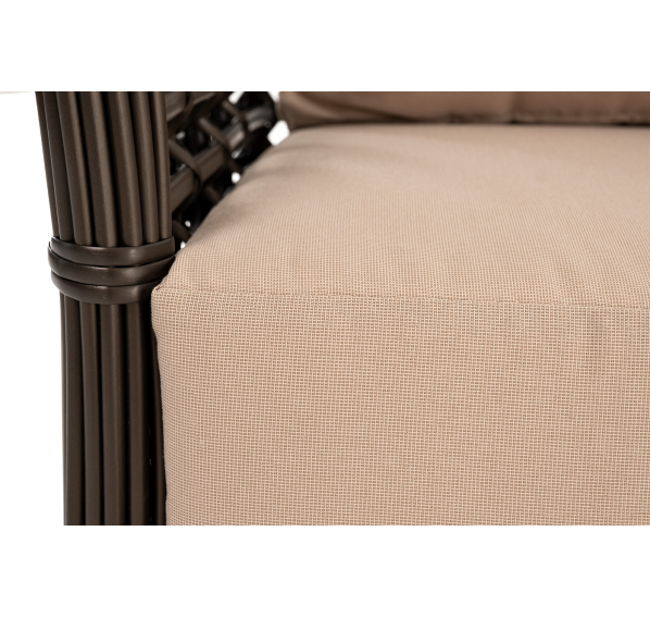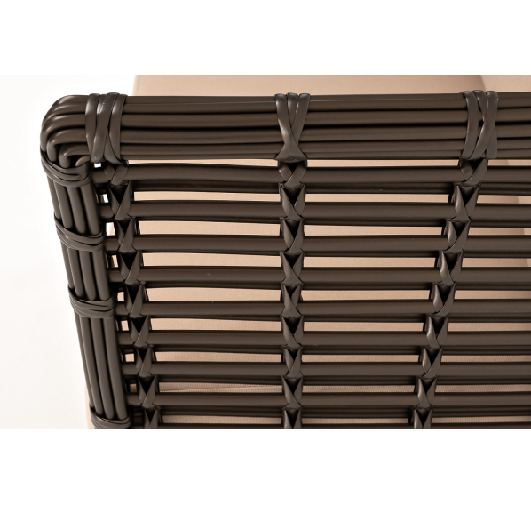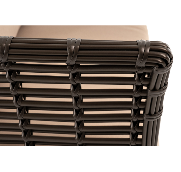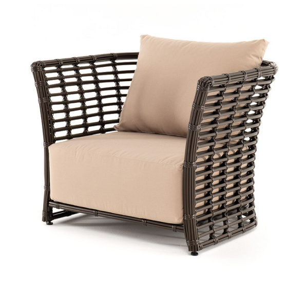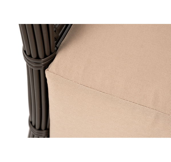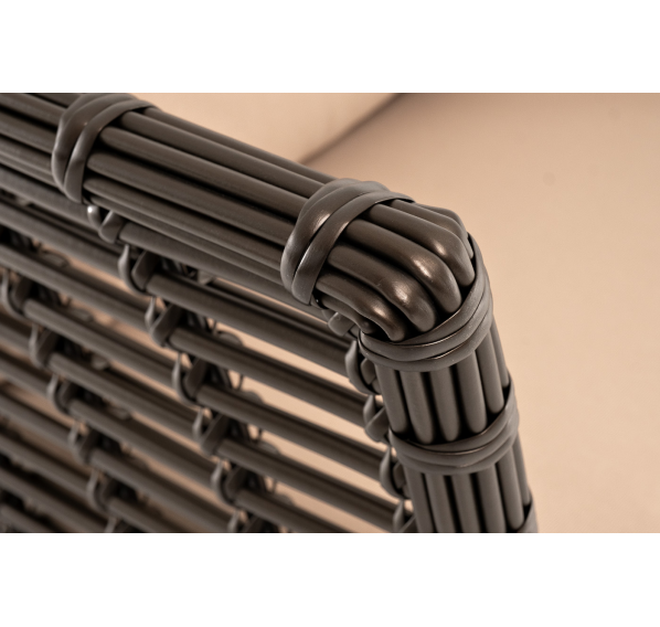 Кресло оснащено каркасом из прочного алюминия, ручное круглое плетение является основным декоративным элементом мебели. Оно выполнено из искусственного ротанга в бронзовом цвете.