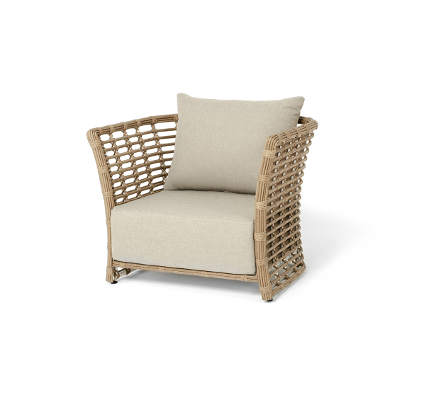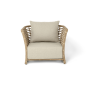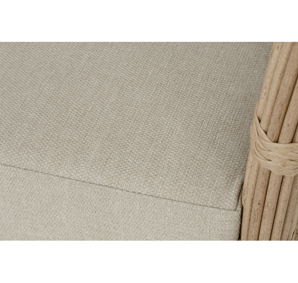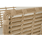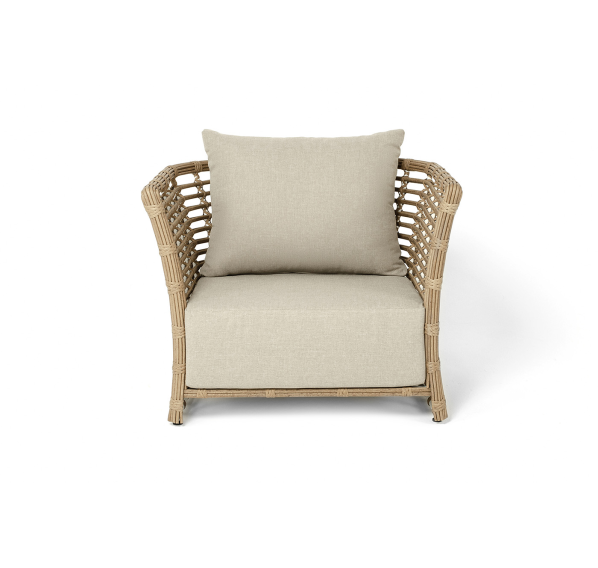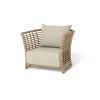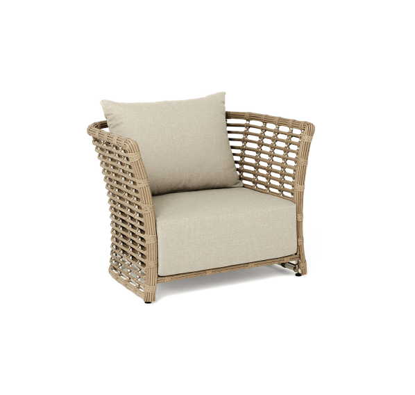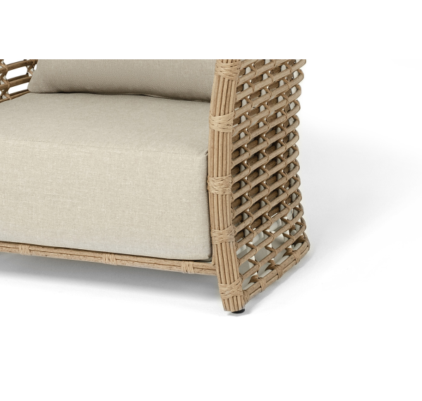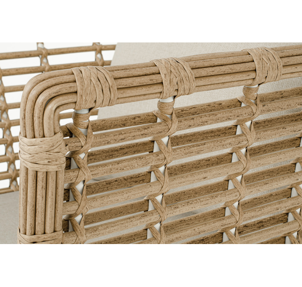 Кресло оснащено каркасом из прочного алюминия, ручное круглое плетение является основным декоративным элементом мебели. Оно выполнено из искусственного ротанга в соломенном цвете.