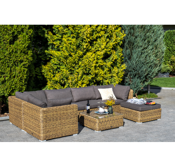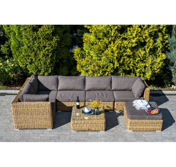 Она имеет каркас из алюминия высокой прочности. Для изготовления используется ручное плетение вида «гиацинт», выполненное из искусственного ротанга. Оттоманка может служить в комплекте с трансформирующимся диваном «Лунго».