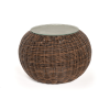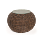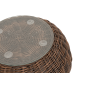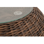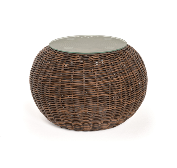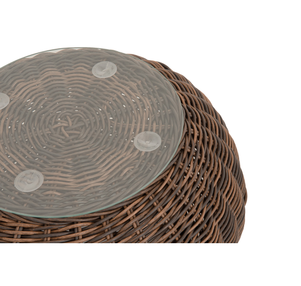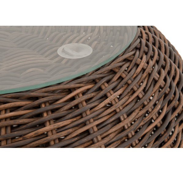 Каркас изготовлен из легкого алюминия и оплетен искусственным ротангом натурального коричневого оттенка. Поверхность столика дополнена стеклянной столешницей из закаленного стекла, толщиной 5 мм.