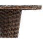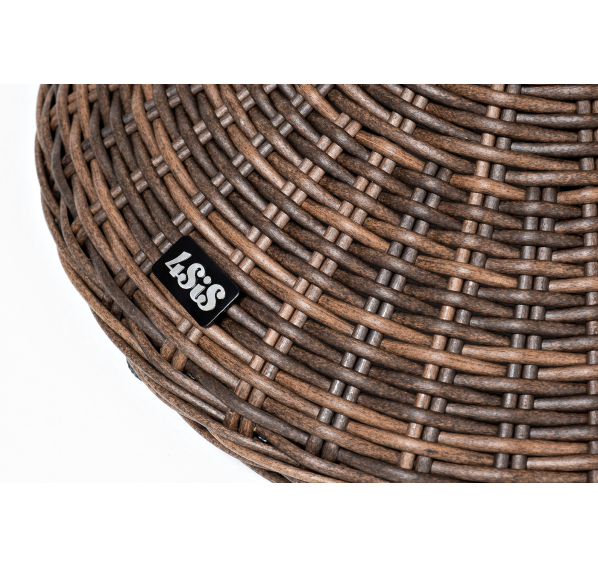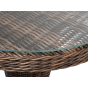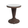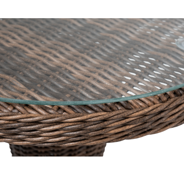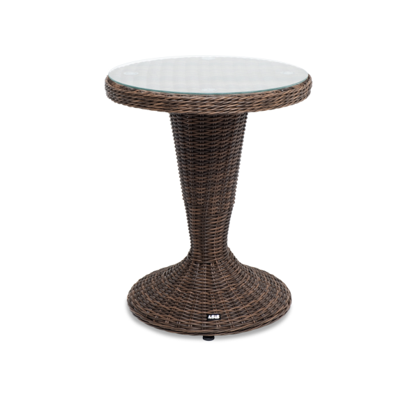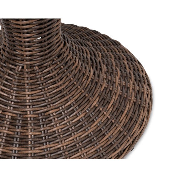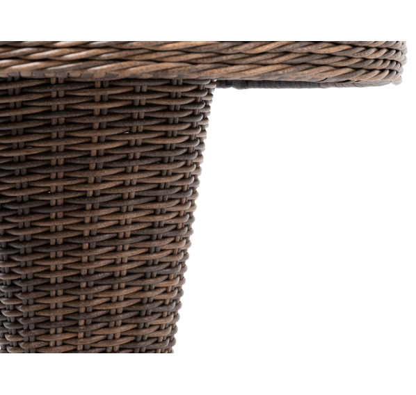 Каркас изготовлен из легкого алюминия и оплетен искусственным ротангом коричневого оттенка. Поверхность столика дополнена стеклянной столешницей из закаленного стекла, толщиной 5 мм.