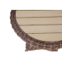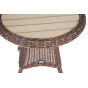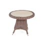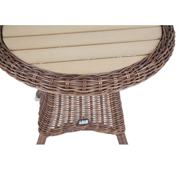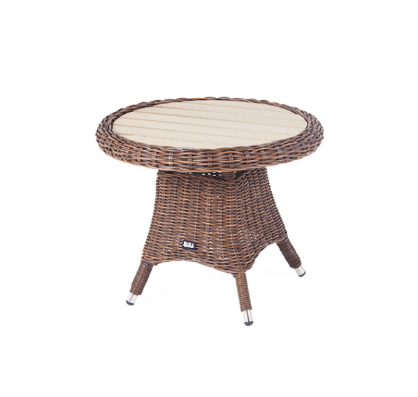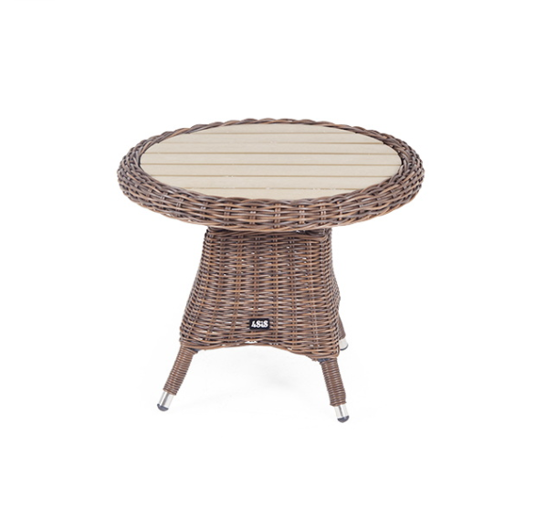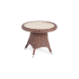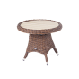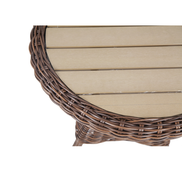 Размер модели – 600×600×480 мм. Столик располагает прочным каркасом, который изготовлен из качественного алюминия, отвечающий за надежное расположение конструкции. Весь каркас оплетен вручную круглым искусственным ротангом коричневого цвета.