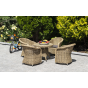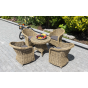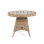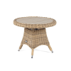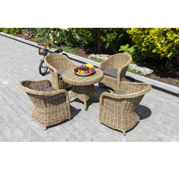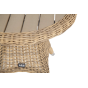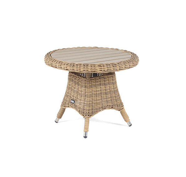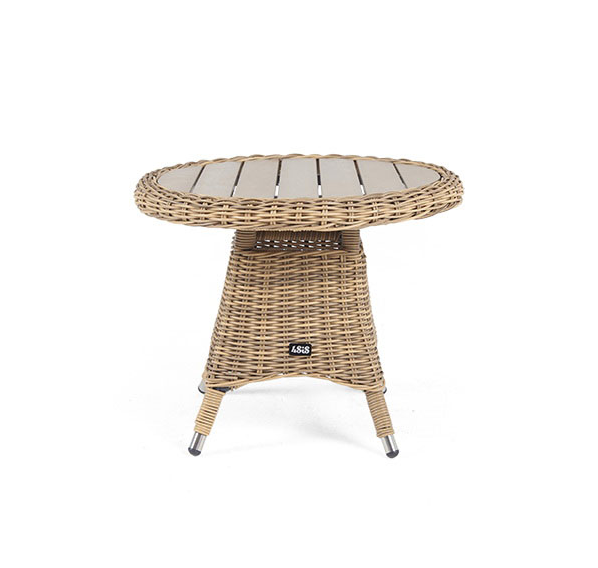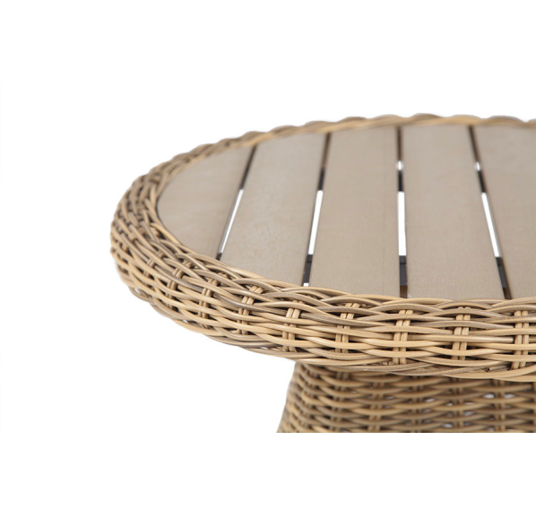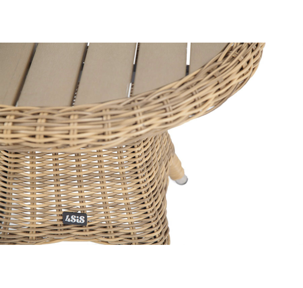 Размер модели – 600×600×480 мм. Столик располагает прочным каркасом, который изготовлен из качественного алюминия, отвечающий за надежное расположение конструкции. Весь каркас оплетен вручную круглым искусственным ротангом соломенного цвета.