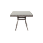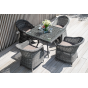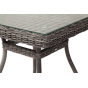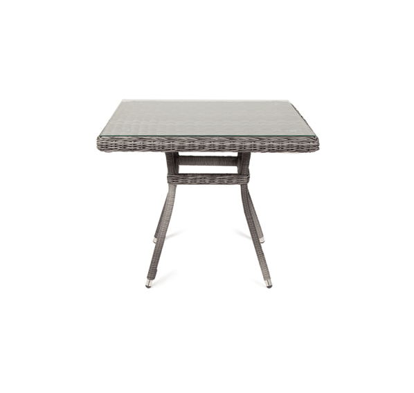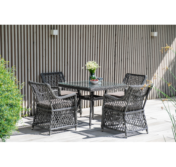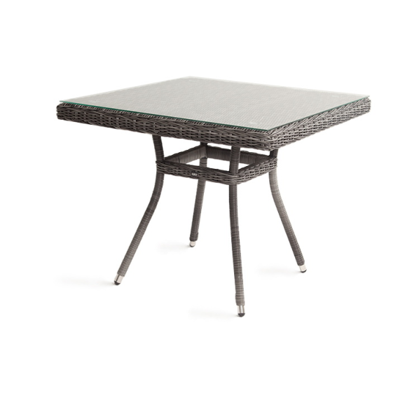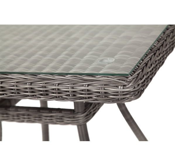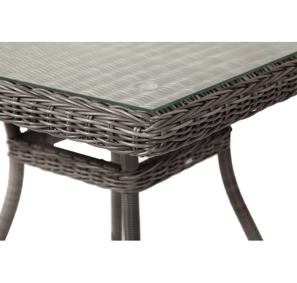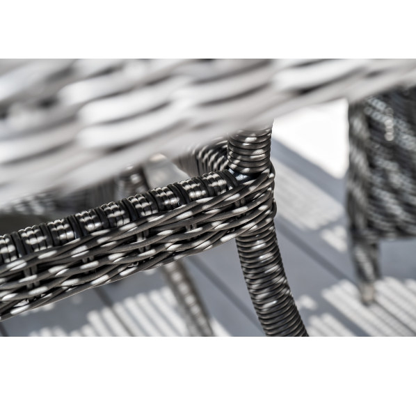Благодаря столешнице из ударопрочного стекла толщиной 5 мм, можно не опасаясь ставить горячую посуду. Каркас изготовлен из прочного алюминия, оплетенного ротангом графитового цвета.