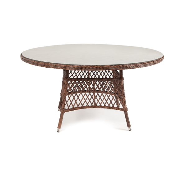 Диаметр рабочей поверхности 150 см, а высота составляет 75 см. Плоскость защищена ударопрочной стеклянной 5 мм столешницей.