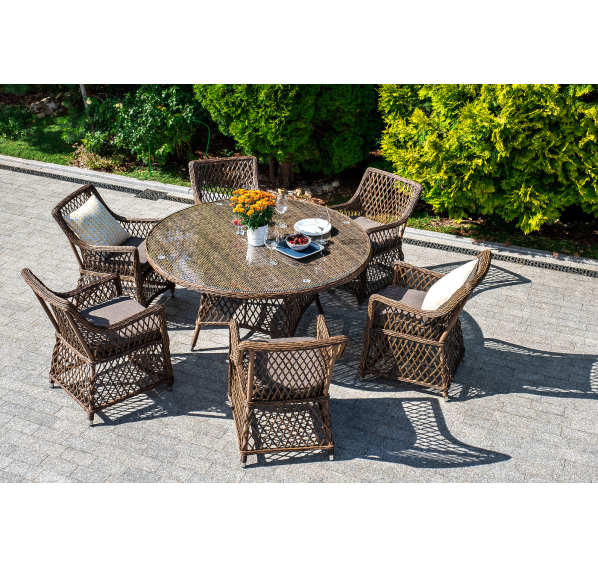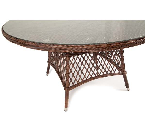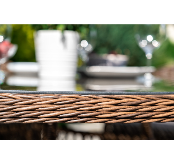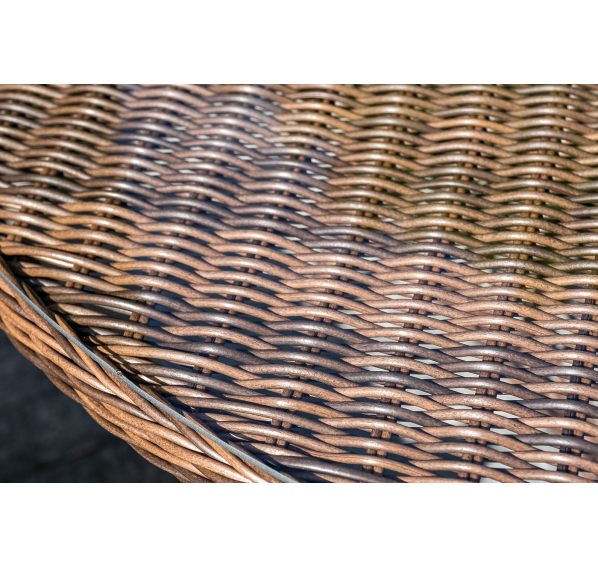 Каркас изготовлен из прочного алюминия, который вручную обвит круглым искусственным ротангом коричневого цвета.