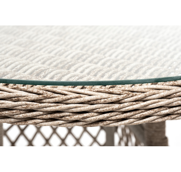 Столешница покрыта прочным стеклом, толщиной 5 мм. Благодаря высокопрочным материалам, обеденный стол очень практичный и подходит для всесезонного использования даже на улице.