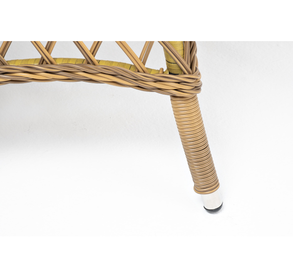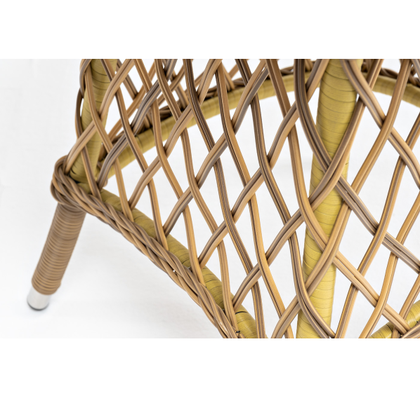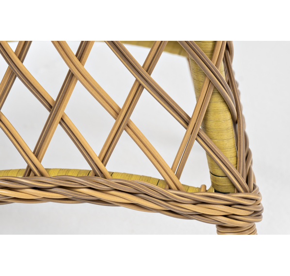 Каркас изготовлен из прочного и очень легкого алюминия. Вручную оплетен синтетическим ротангом натурального соломенного оттенка.