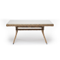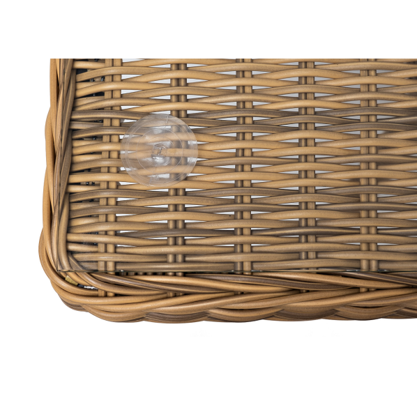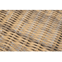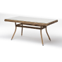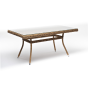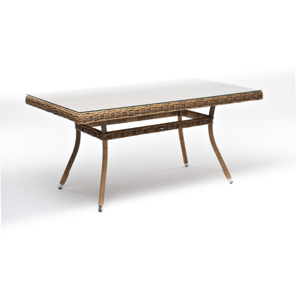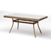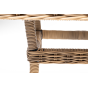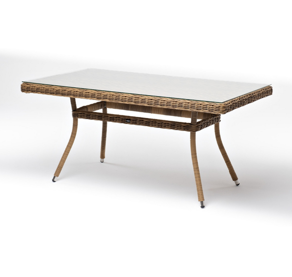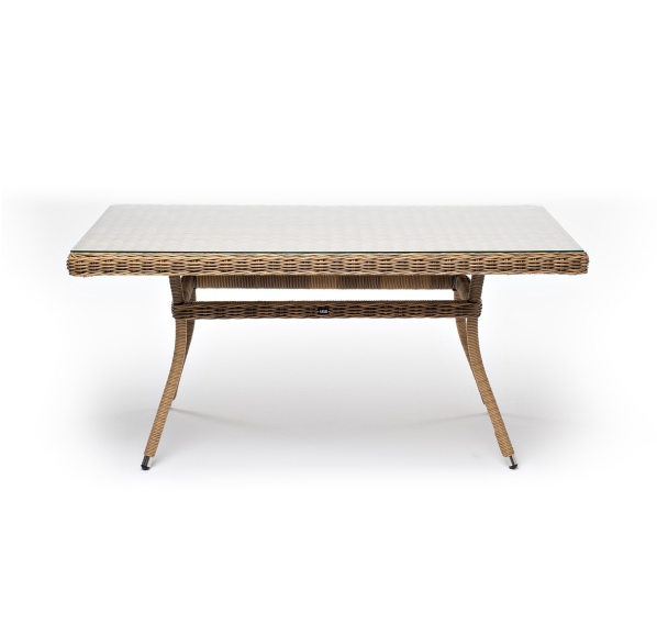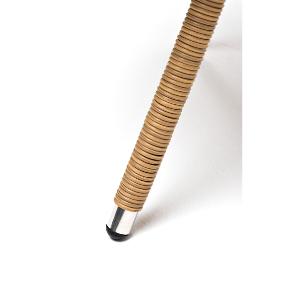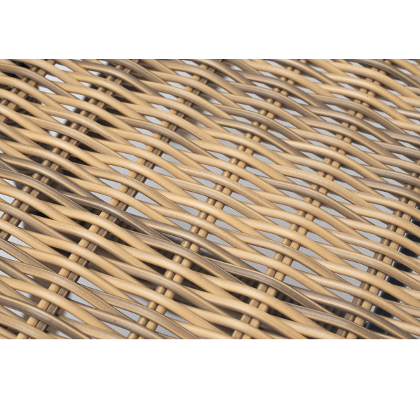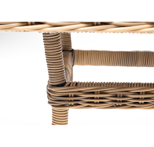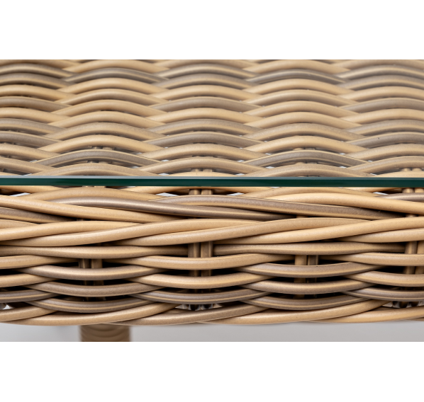 Каркас произведен из прочного алюминия, оплетка которого, выполнена вручную ротангом соломенного цвета. Поверхность защищает стеклянная столешница, толщиной 5 мм.