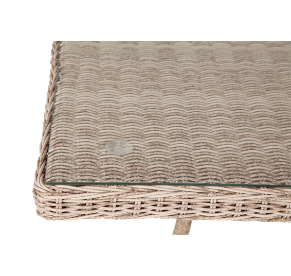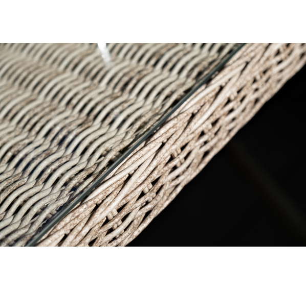 Каркас изготовлен из прочного и легкого алюминия, оплетенного с помощью ручного метода искусственным ротангом бежевого оттенка.