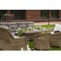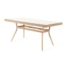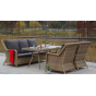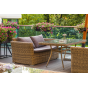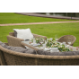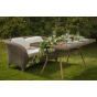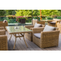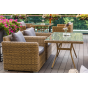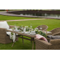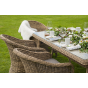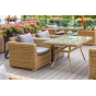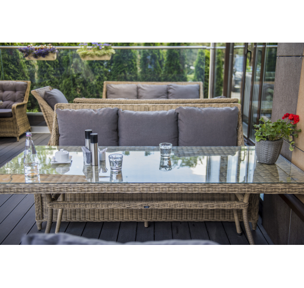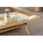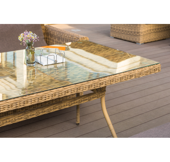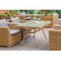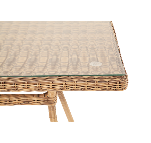 Каркас садового стола изготовлен из алюминия, вручную оплетенного круглым искусственным ротангом натурального соломенного оттенка.