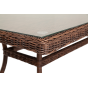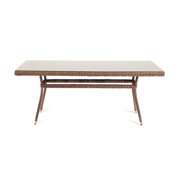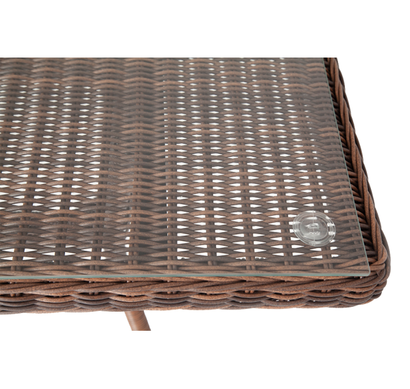 Каркас изделия изготовлен из прочного, но очень легкого алюминия, оплетенного вручную искусственным ротангом круглого плетения насыщенного шоколадного оттенка. Это долговечный материал, устойчивый к переменам погоды, атмосферным осадкам, прямым солнечным лучам. Благодаря ему стол можно использовать круглогодично под открытым небом.