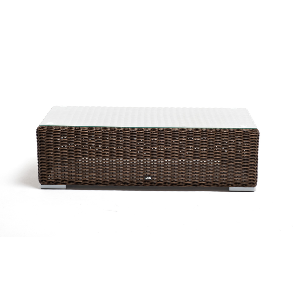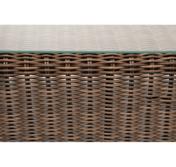 Каркас столика изготовлен из алюминия, вручную оплетенного круглым искусственным ротангом.