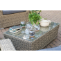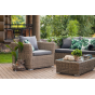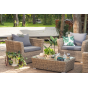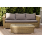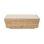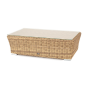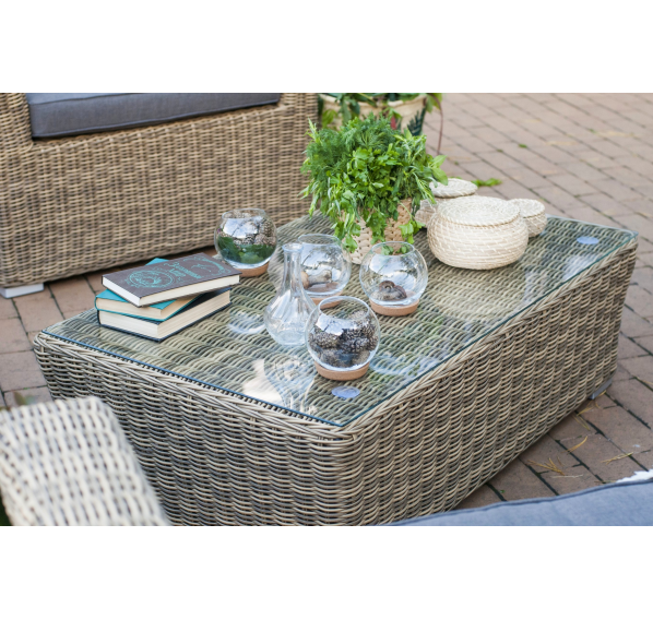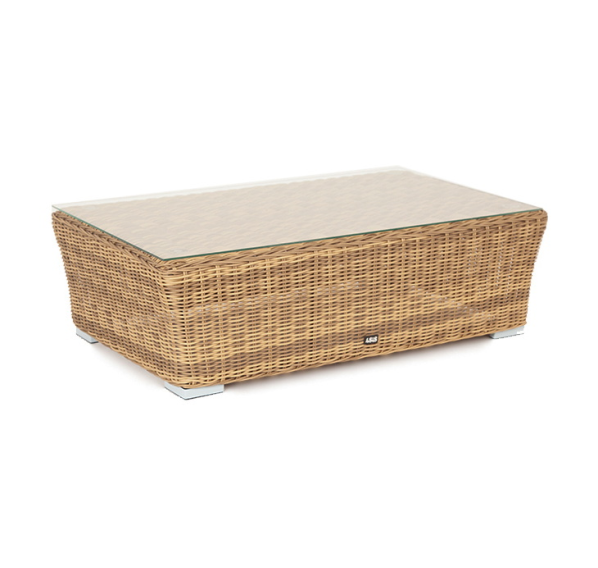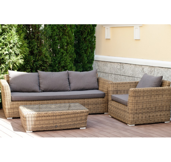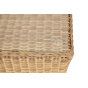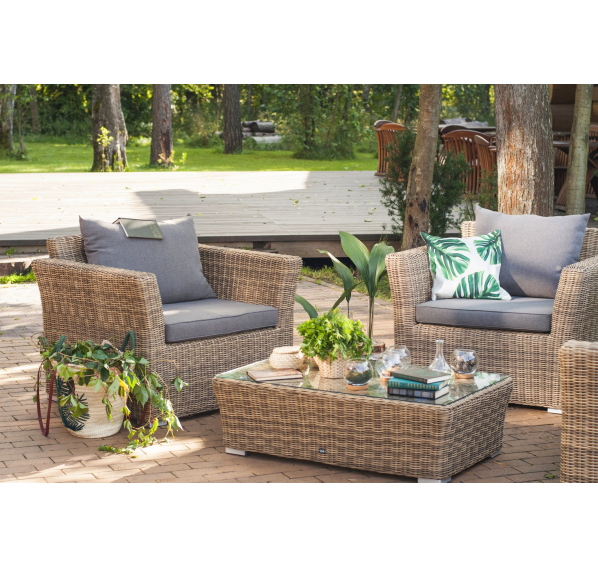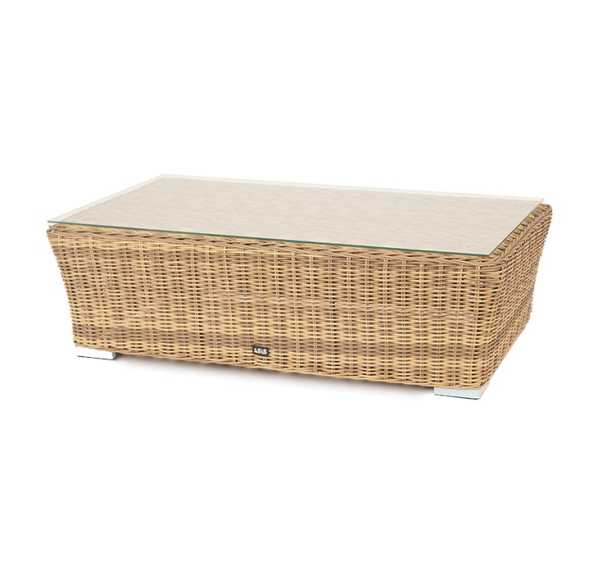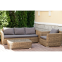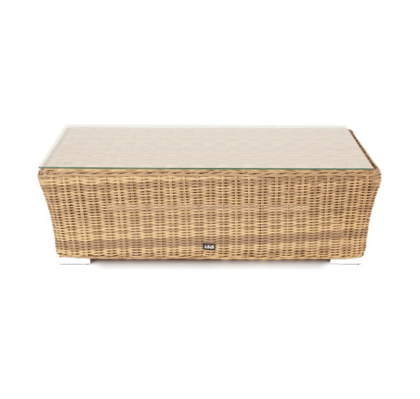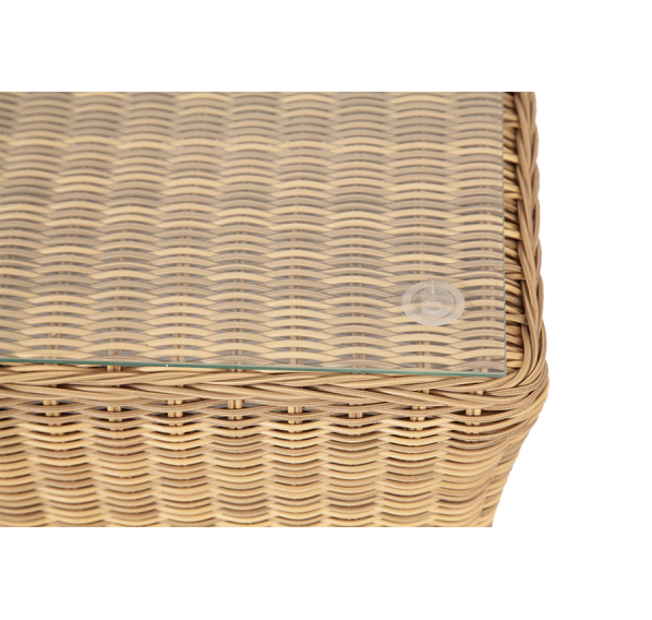 Размер модели – 1100×660×340 мм. Устойчивость и прочность ей придает каркас, выполненный из высококачественного алюминия. Каркас оплетен вручную с помощью круглого искусственного ротанга. Мебель выполнена в соломенном цвете.