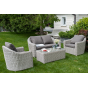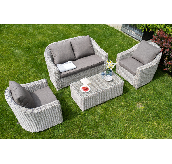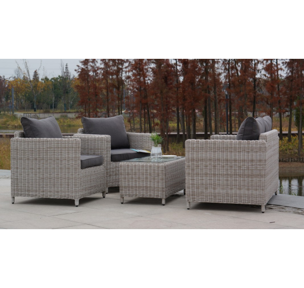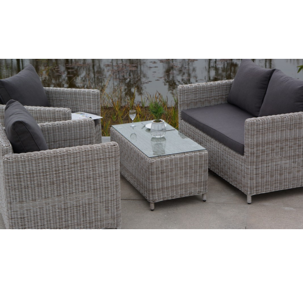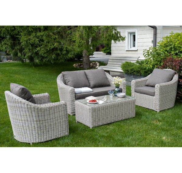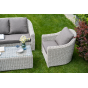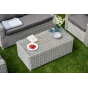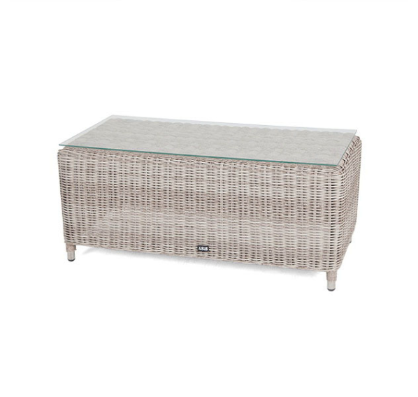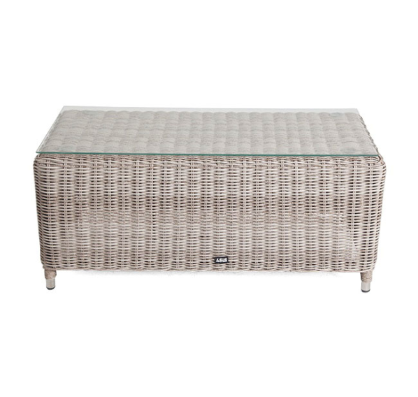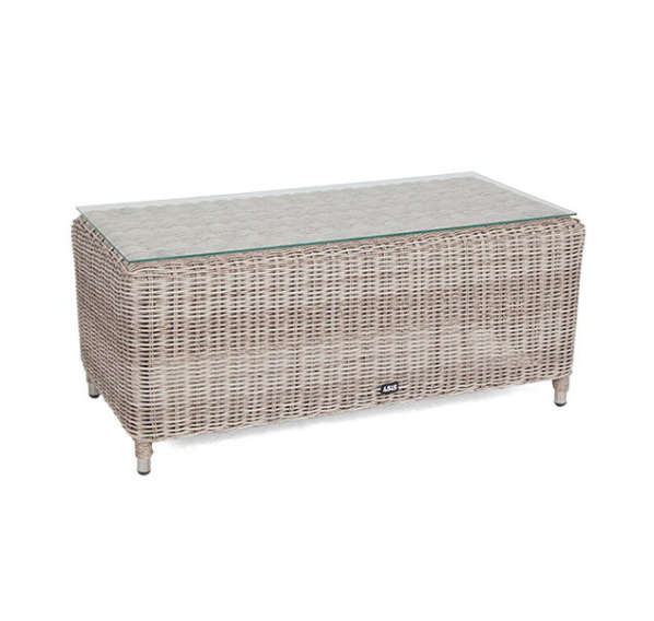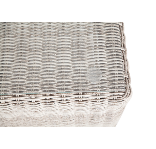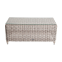 Журнальный столик «Кон Панна» изготовлен из алюминиевого каркаса, вручную оплетенного круглым искусственным ротангом бежевого оттенка.
