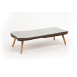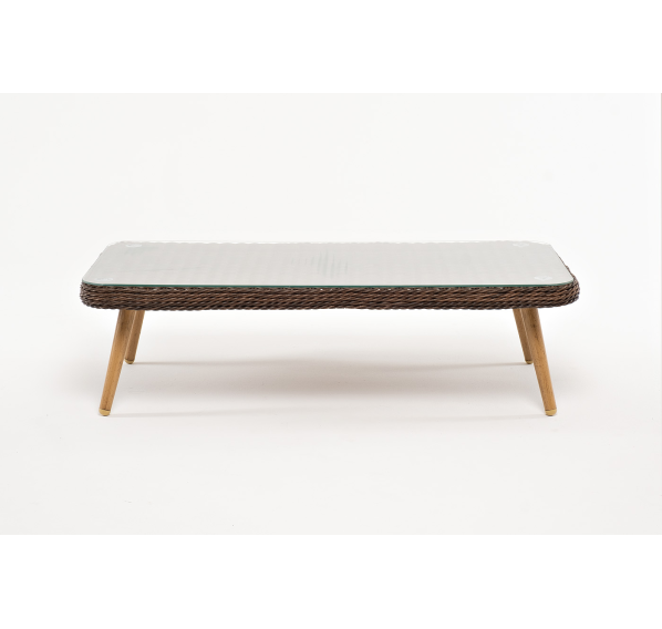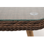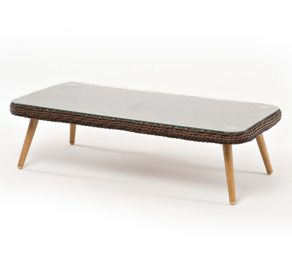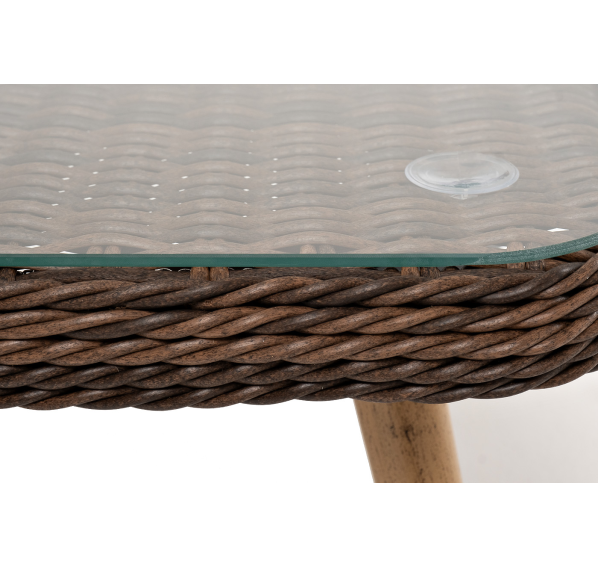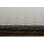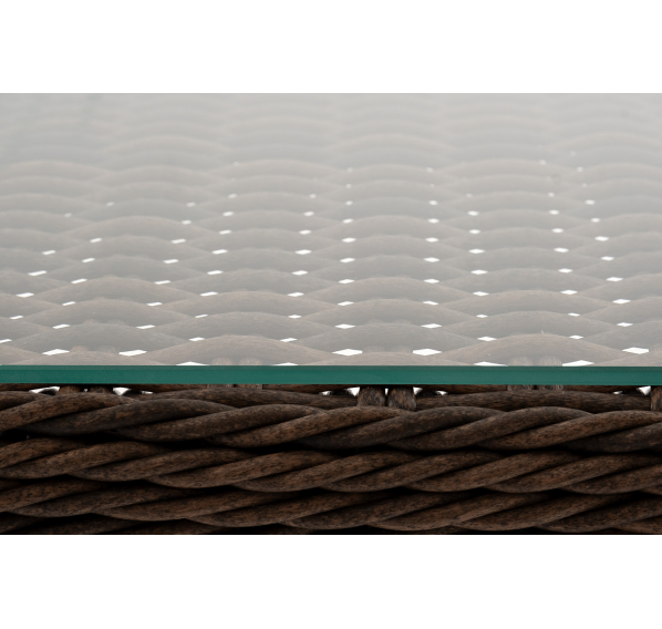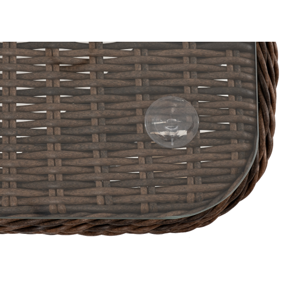 Столешницу из ротангового плетения дополняет прочное стекло, используемое для изготовления мебели. Стекло крепится с помощью держателей на силиконовых присосках и транспортируется в собранном виде.