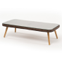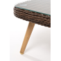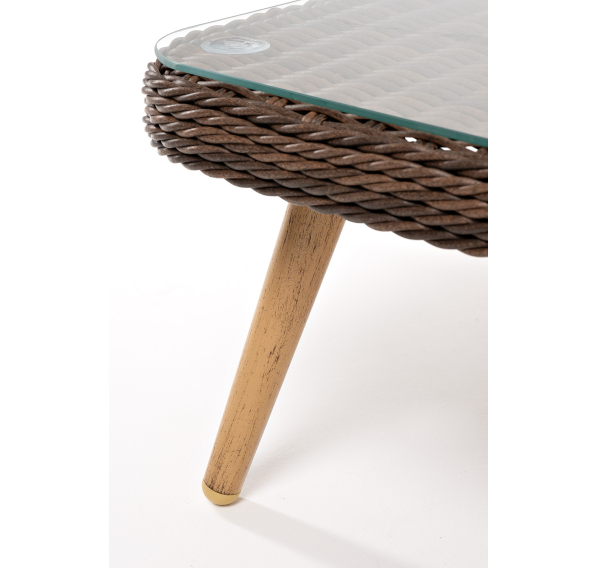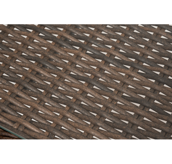 Алюминиевый каркас имеет цвет натурального дерева. Столик дополняет декоративная оплетка, при изготовлении которой используется круглый искусственный ротанг. Она представлена в коричневом цвете.