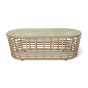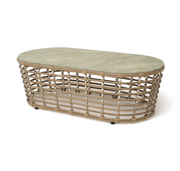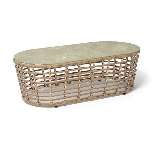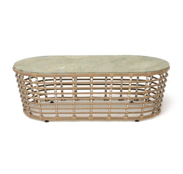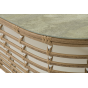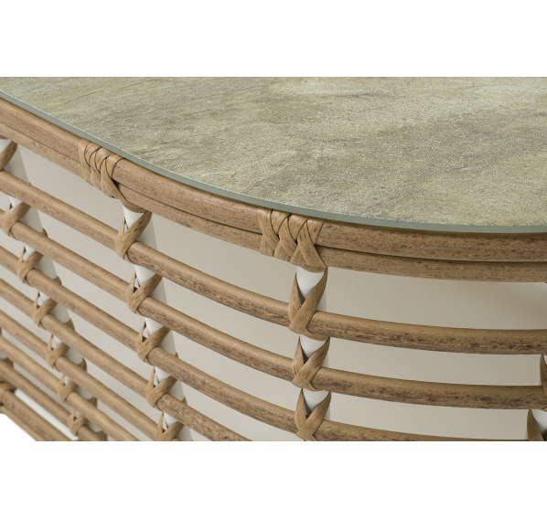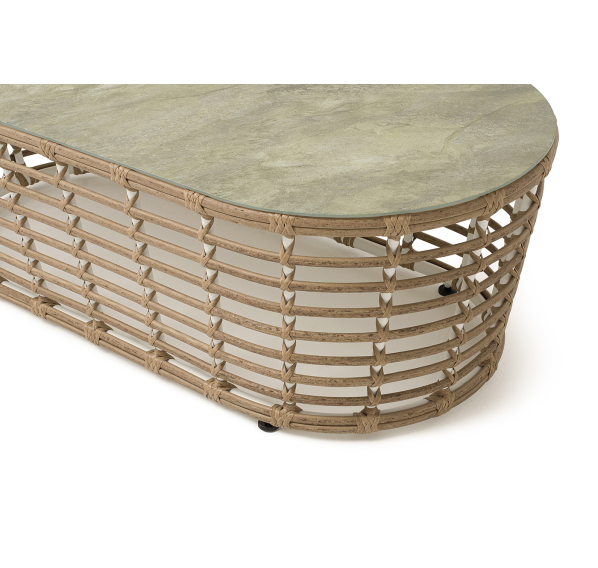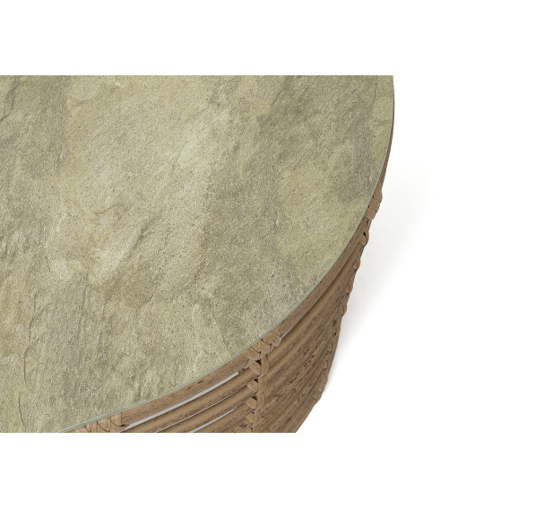 Каркас столика изготовлен из алюминия, вручную оплетенного круглым искусственным ротангом.
