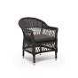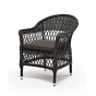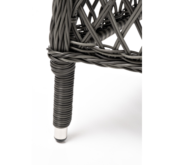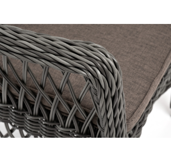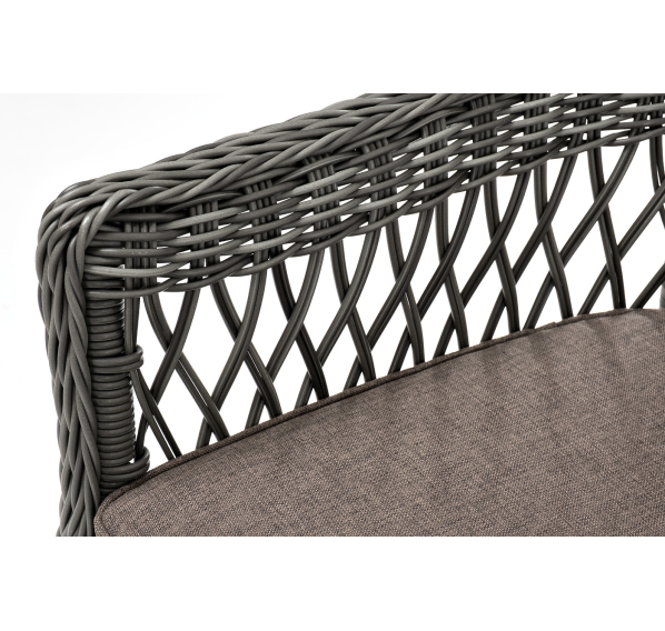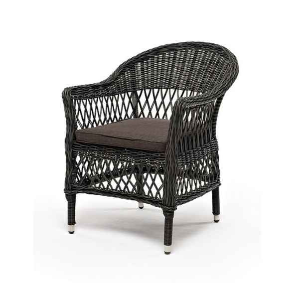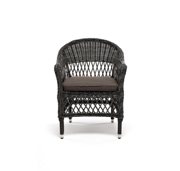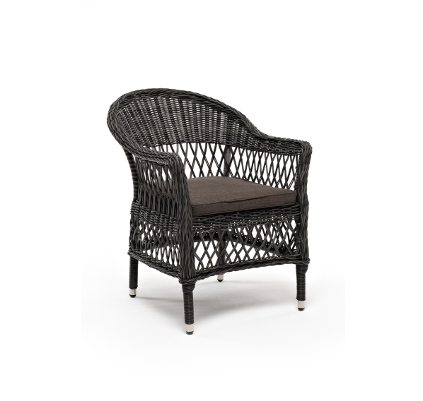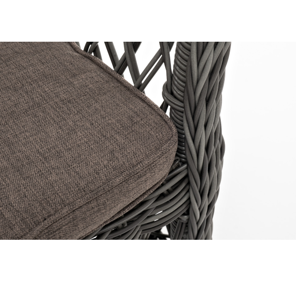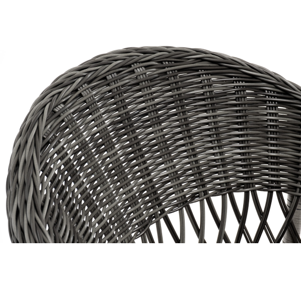 Стул оплетен вручную круглым искусственным ротангом графитового оттенка. В комплекте представлена мягкая подушка-сиденье серого цвета. Подушка имеет съёмный чехол из полиэстера (100%), плотностью 300гр/м2, с влагоотталкивающей пропиткой.