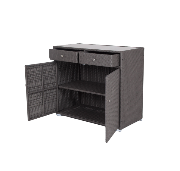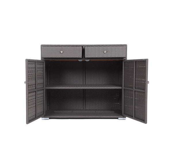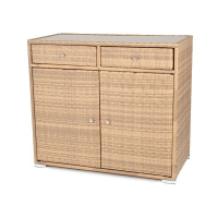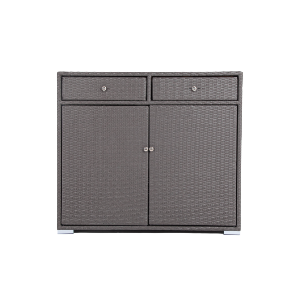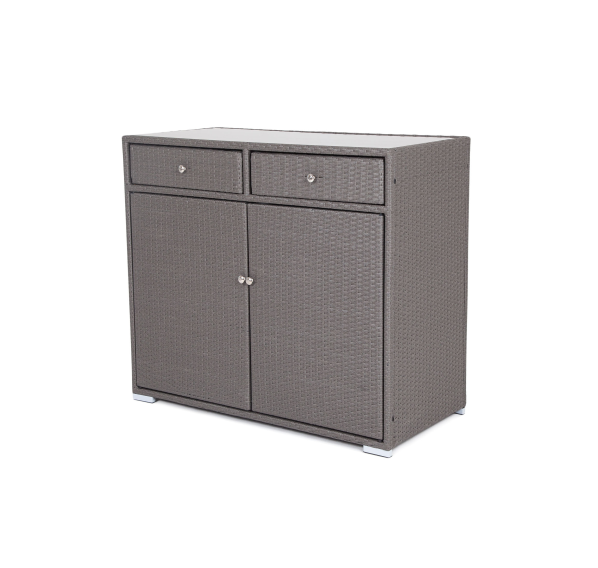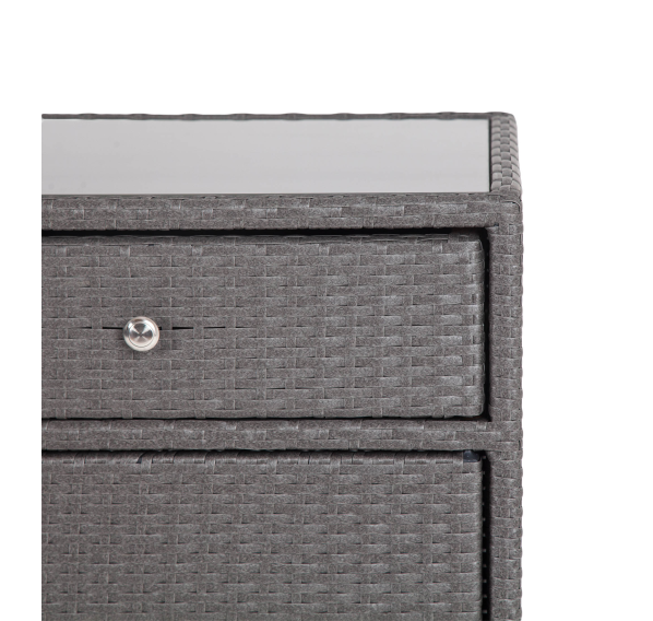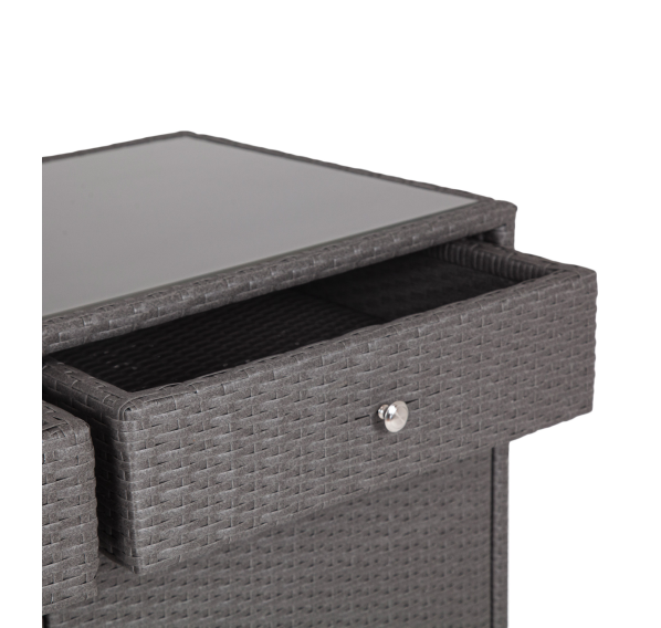 «Мальта» тумба изготовлена из алюминиевого каркаса, оплетенного плоским искусственным ротангом графитового цвета.