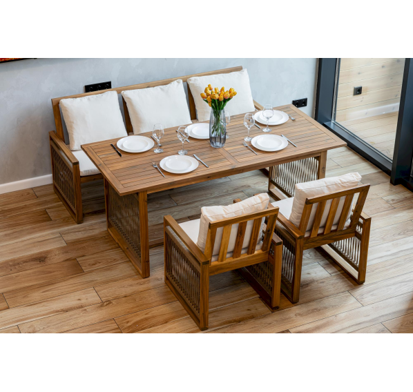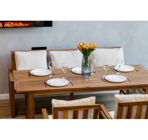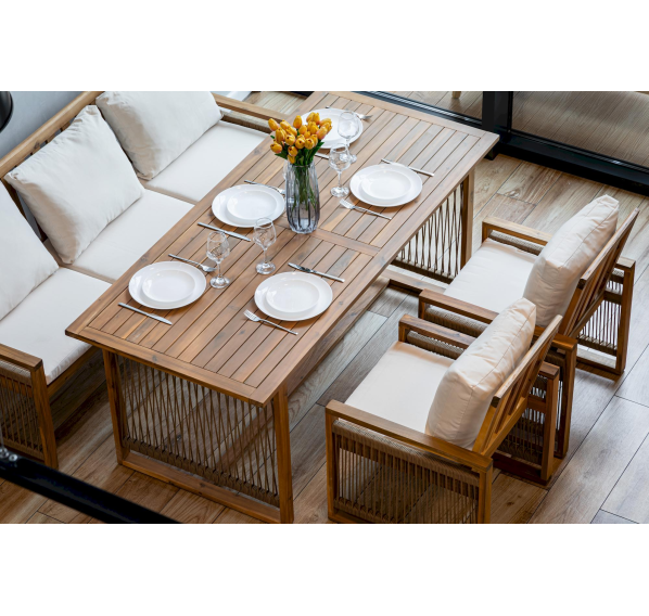 Обеденный комплект из акации GRAND MICHELLE с диваном в бежевом цвете представляет собой идеальное решение для создания уютной обеденной зоны на открытом воздухе.