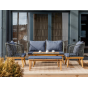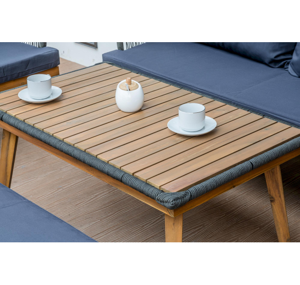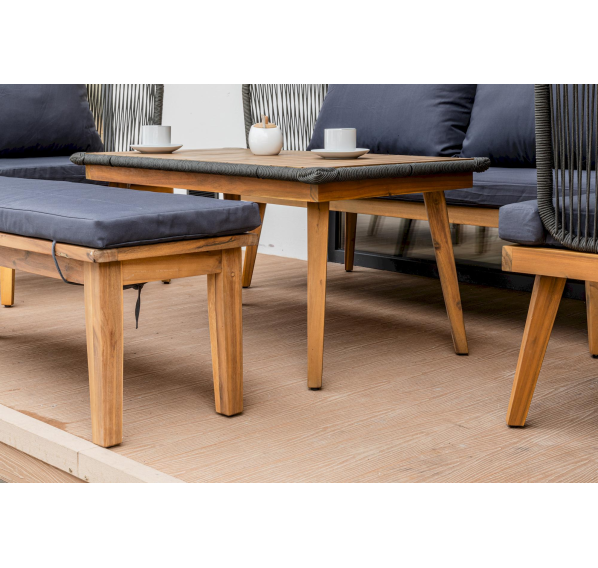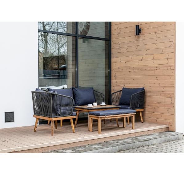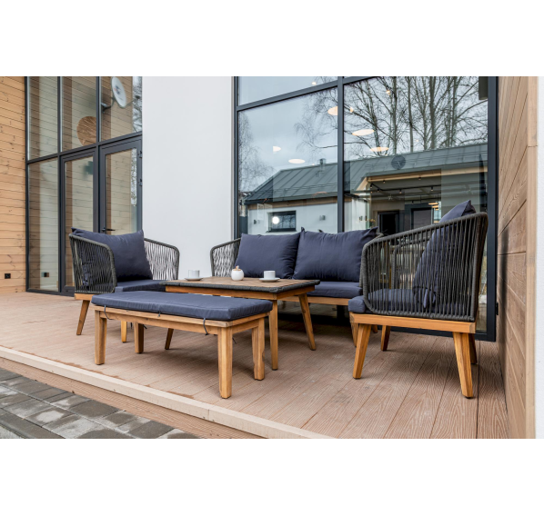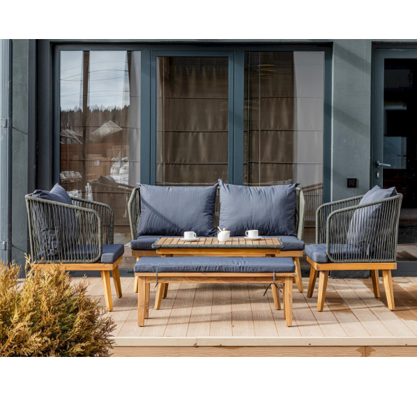 Представляем вам обеденный комплект из акации EMMA в сером цвете — идеальное решение для создания уютного и стильного уличного пространства. В этот набор входит диван, два кресла, скамья и журнальный стол, все изготовленные из обработанной под тик акации. Этот материал не только выглядит роскошно, но и обеспечивает надежную защиту от влаги, что делает мебель долговечной и подходящей для использования на открытом воздухе.
