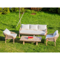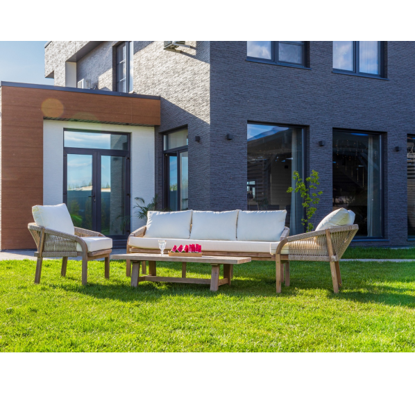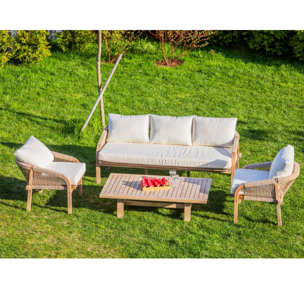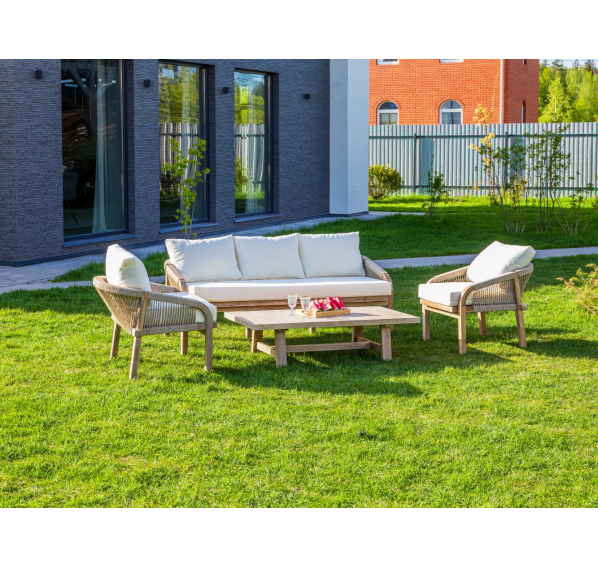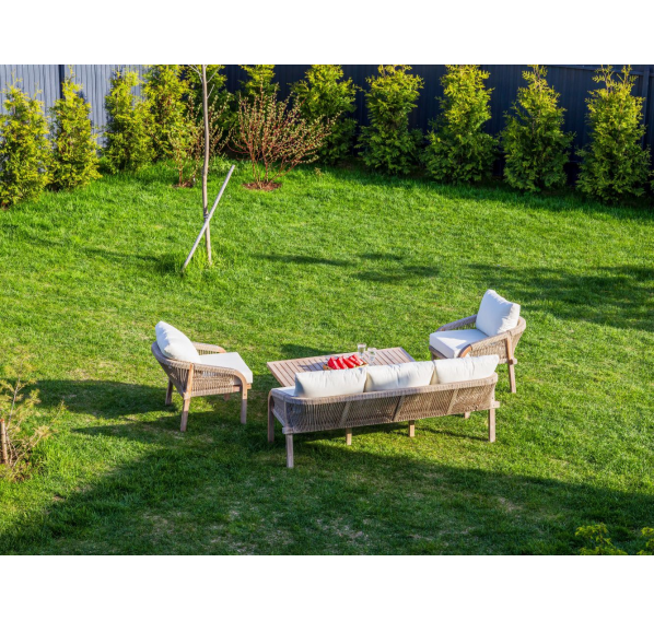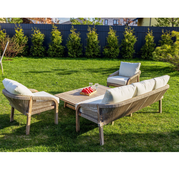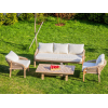 Лаунж-зона MICHELLE в бежевом цвете — идеальное решение для создания уютного и стильного уличного пространства. Этот комплект включает в себя удобный диван, два кресла и журнальный столик, обеспечивая комфортное размещение до 5 человек.