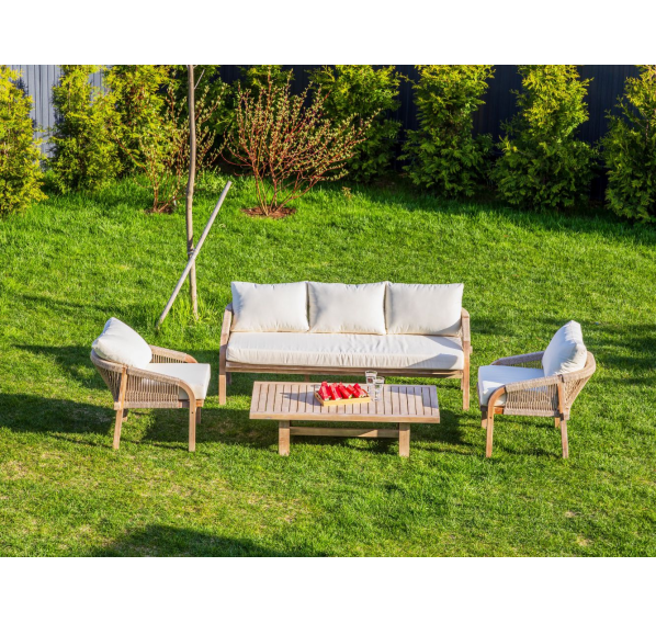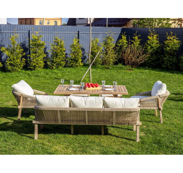 Материалы изготовления — высококачественная акация (teak-look) и уличная веревка, обеспечивающие надежность и долговечность.