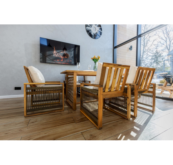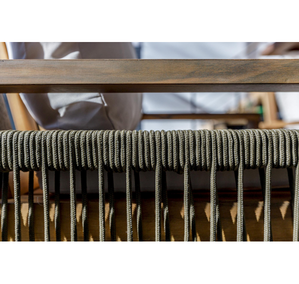 Обивка кресел выполнена из роупа оливкового цвета, которая не только выглядит стильно, но и обладает устойчивостью к экстремальным погодным условиям. Под воздействием солнца роупа не выцветает, что позволяет сохранить первоначальный вид мебели на протяжении долгого времени.