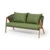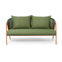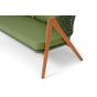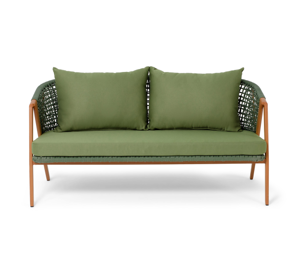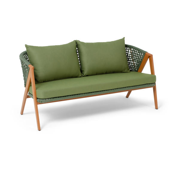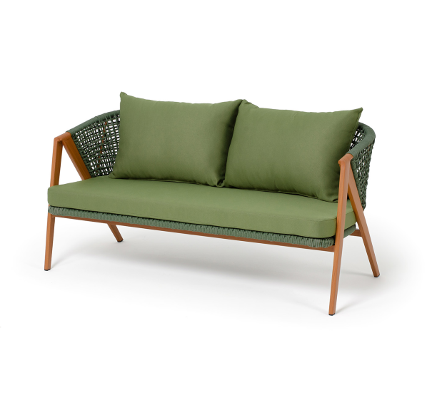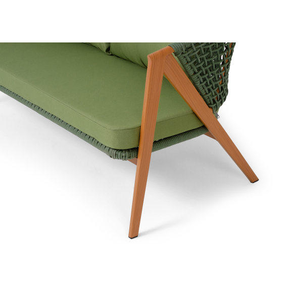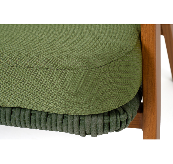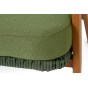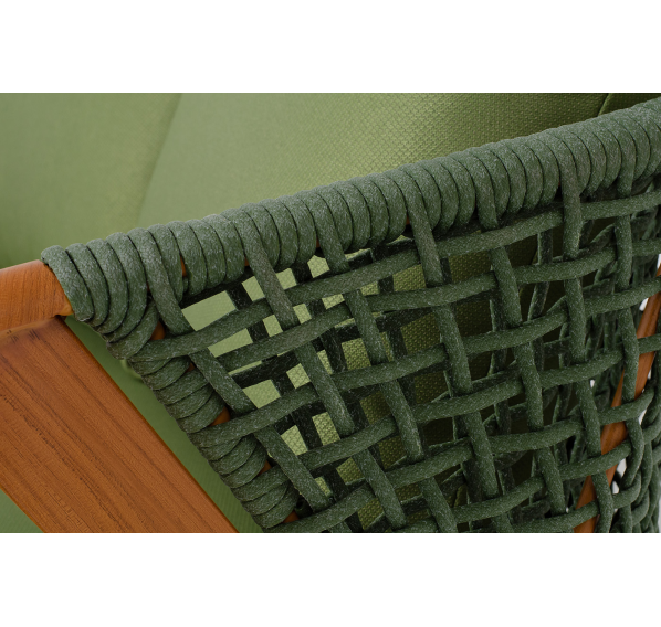 Изготовлен из алюминиевого каркаса, оплетенного вручную эластичными синтетическими лентами из высокопрочных полиэфирных волокон. Роуп является гипоаллергенным, прочным, износостойким и устойчивым к ультрафиолету. Приятный на ощупь и напоминает шерстяное плетение. Цвет каркаса – «под дерево», оплетки - зеленый. На ножках стула идут черные пластиковые наконечники (заглушки).
