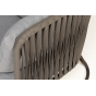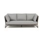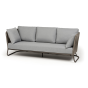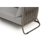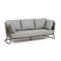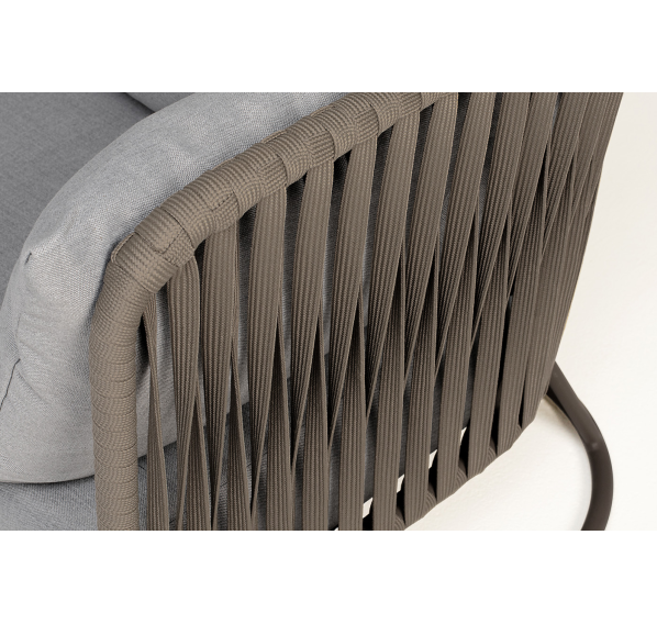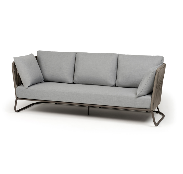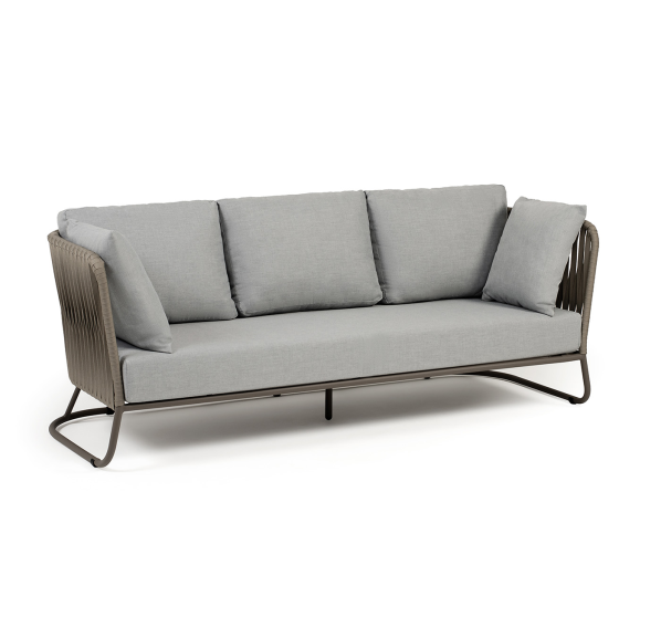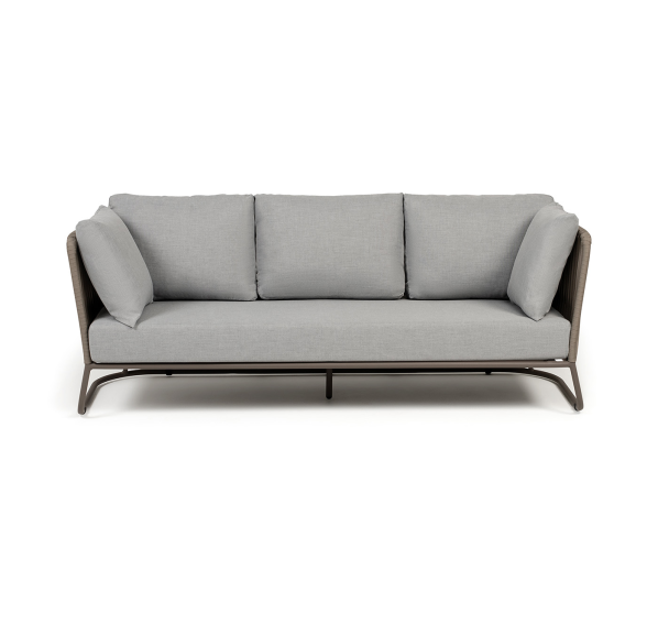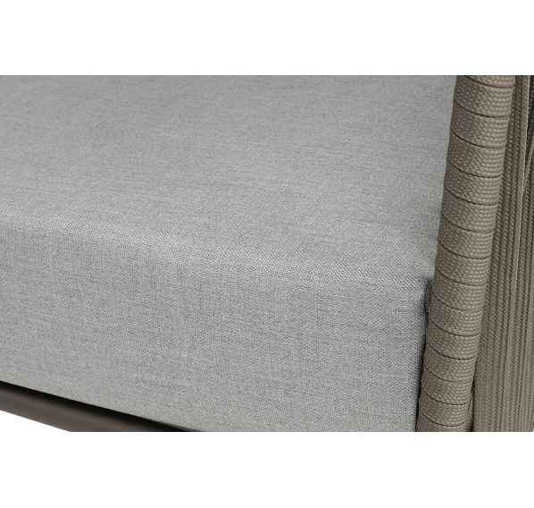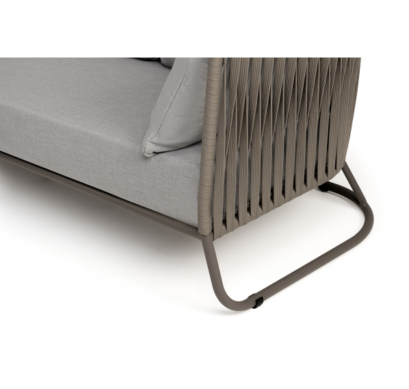 Диван имеет алюминиевый каркас, окрашенный порошковой краской в бежево-серый (RAL7006) цвет. Боковины каркаса вручную оплетены роупом - эластичными синтетическими лентами, изготовленными из высокопрочных полиэфирных волокон. Цвет оплетки - серо-коричневый.
