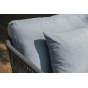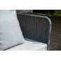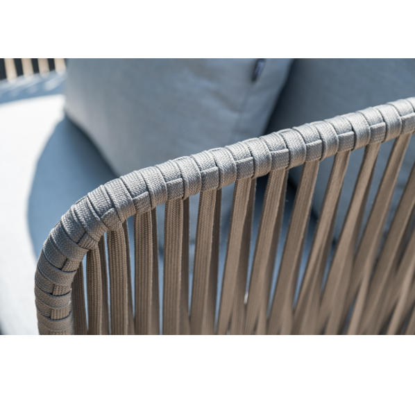 Диван имеет алюминиевый каркас, окрашенный порошковой краской в темно-серый (RAL7024) цвет. Боковины каркаса вручную оплетены роупом - эластичными синтетическими лентами, изготовленными из высокопрочных полиэфирных волокон. Цвет оплетки - серый.