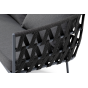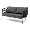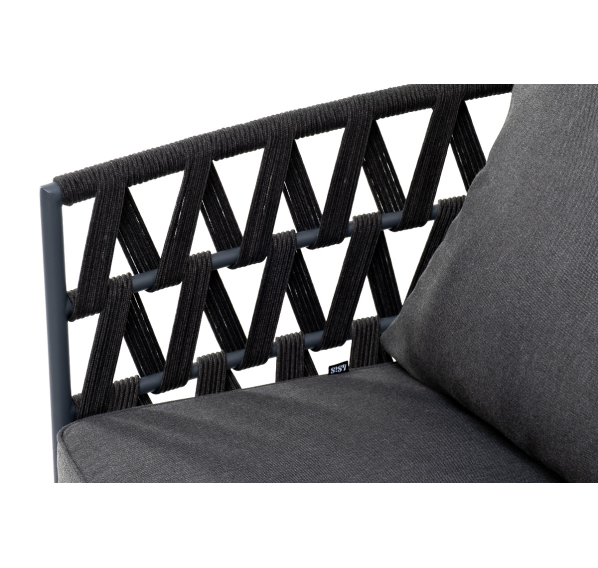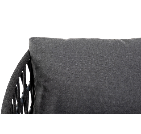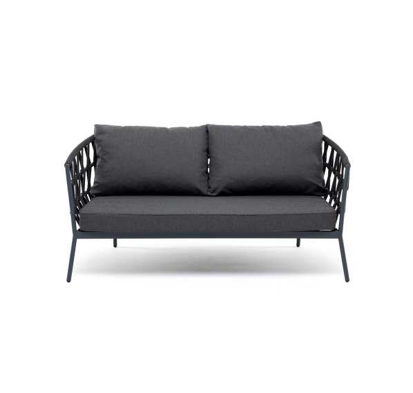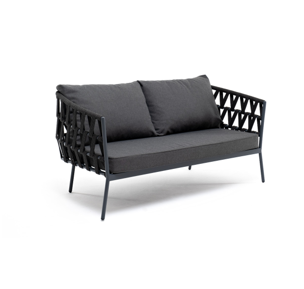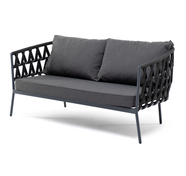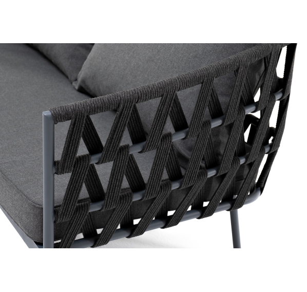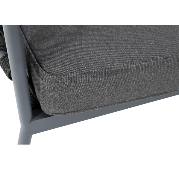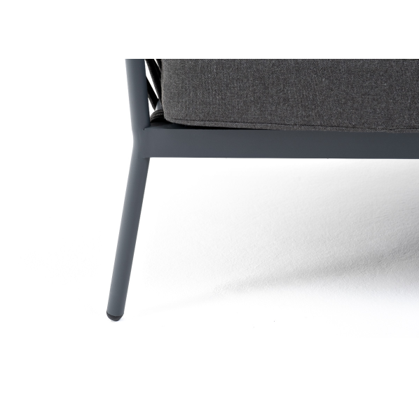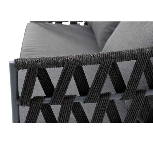 Диван имеет алюминиевый каркас, окрашенный порошковой краской в темно-серый (RAL7024) цвет. Боковины каркаса и спинка вручную оплетены роупом - эластичными синтетическими лентами, изготовленными из высокопрочных полиэфирных волокон. Цвет оплетки - темно-серый.