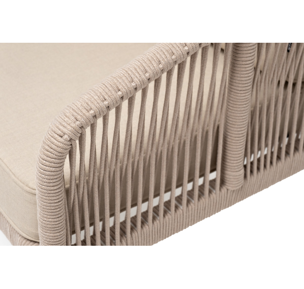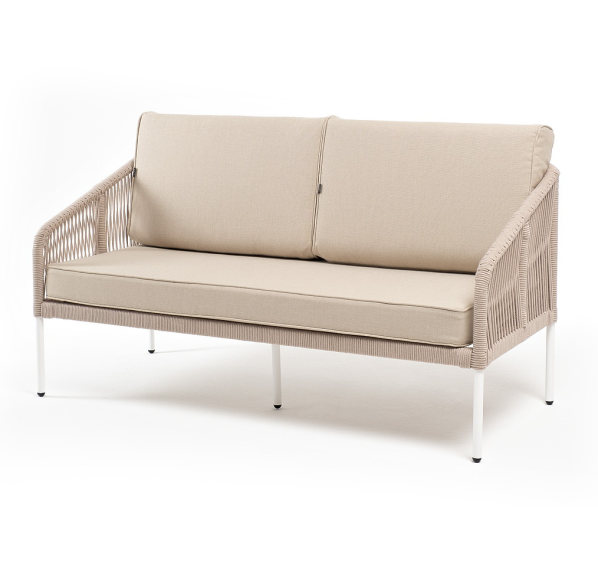 Диван имеет алюминиевый каркас, окрашенный порошковой краской в белый цвет. Боковины каркаса вручную оплетены роупом - эластичными синтетическими лентами, изготовленными из высокопрочных полиэфирных волокон бежевого цвета.