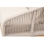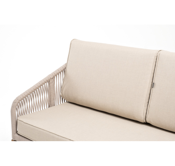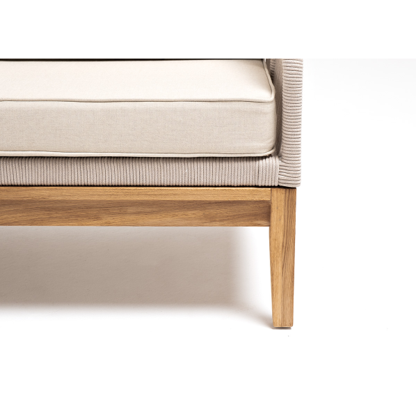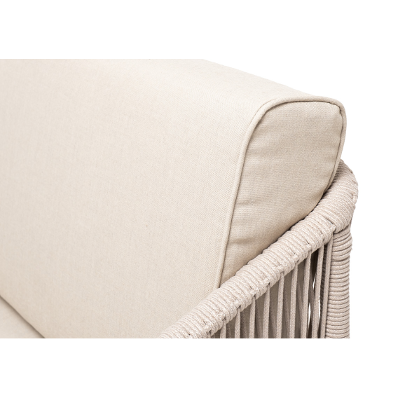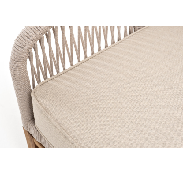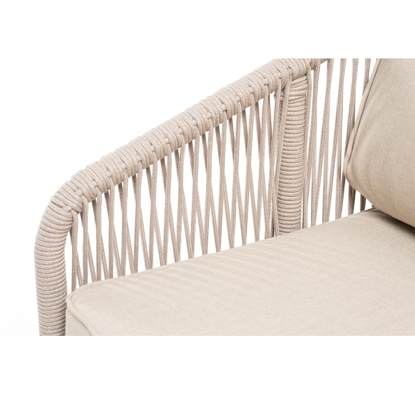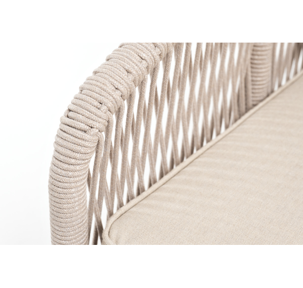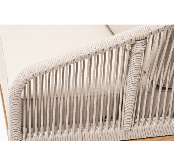 Боковины каркаса и спинка вручную оплетены роупом - эластичными синтетическими лентами, изготовленными из высокопрочных полиэфирных волокон. Цвет оплетки - бежевый. Основание - дуб.