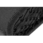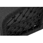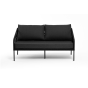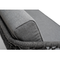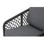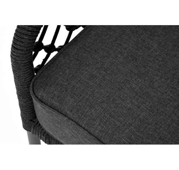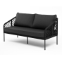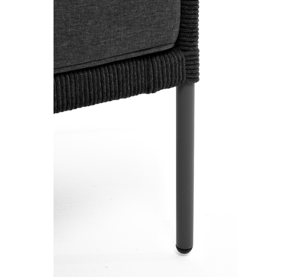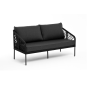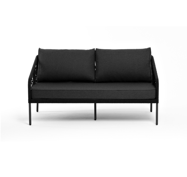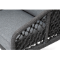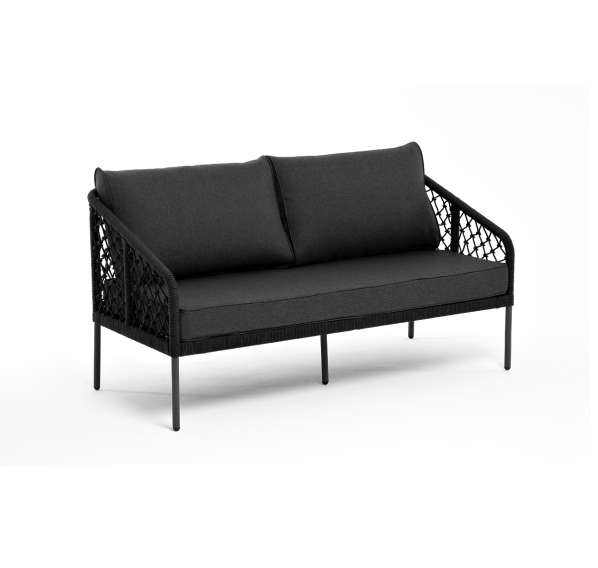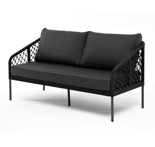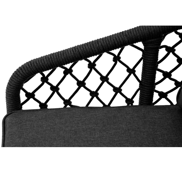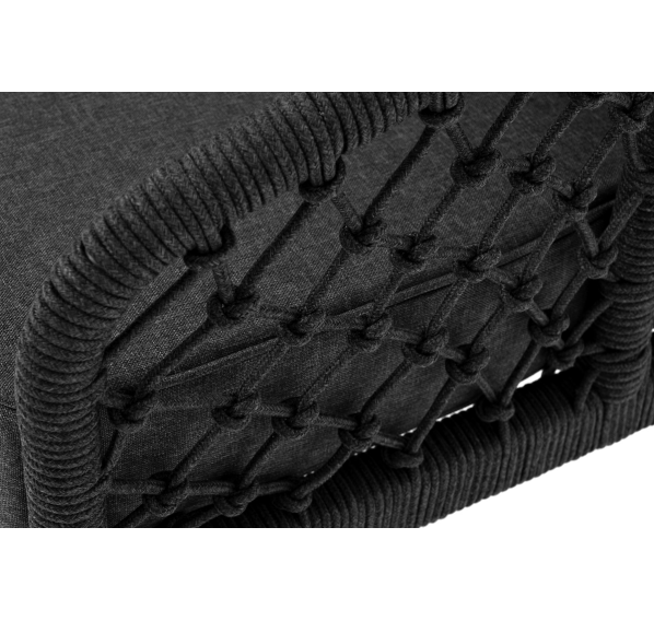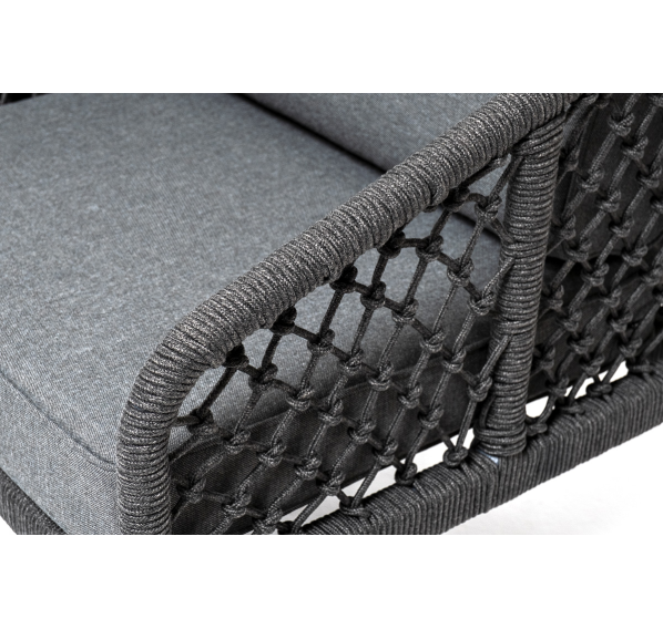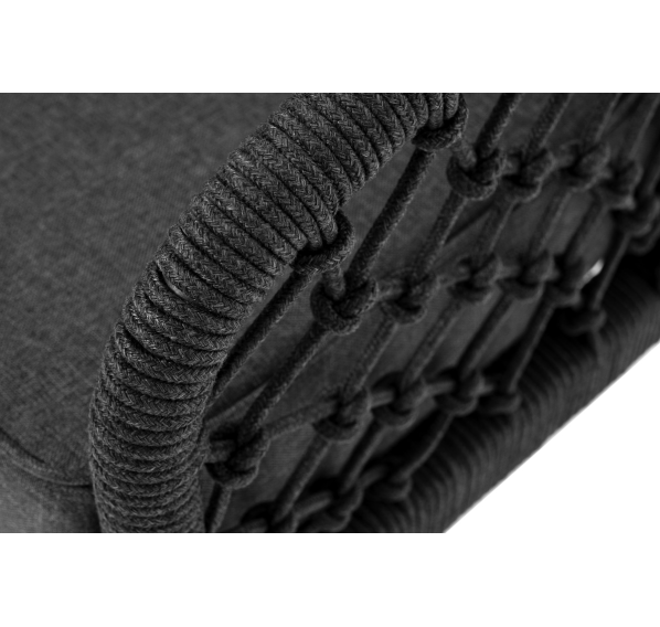 Диван имеет алюминиевый каркас, окрашенный порошковой краской в темно-серый (RAL7024) цвет. Боковины каркаса и спинка вручную оплетены роупом, в плетении «узелки» - эластичными синтетическими лентами, изготовленными из высокопрочных полиэфирных волокон. Цвет оплетки в тон каркасу - темно-серый.