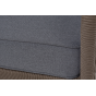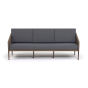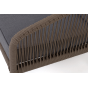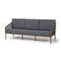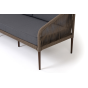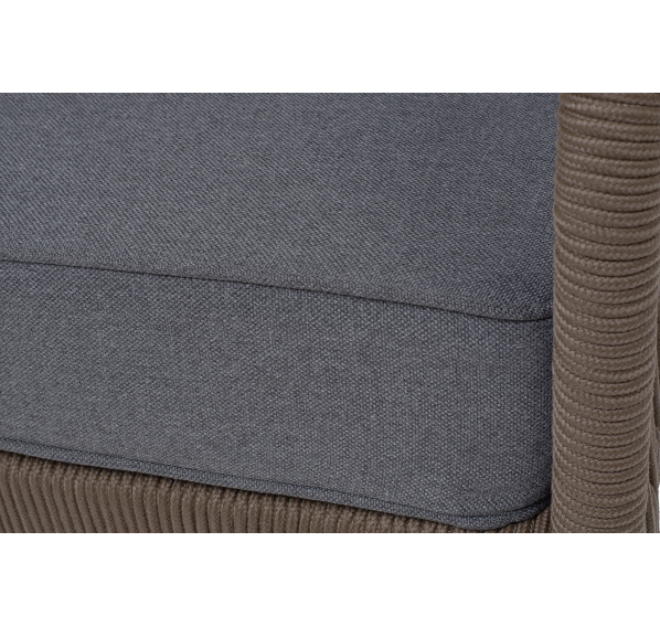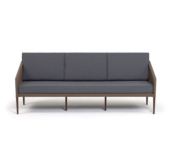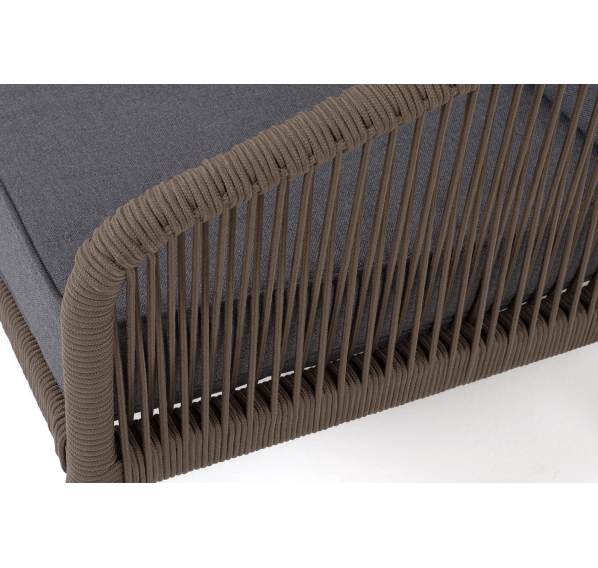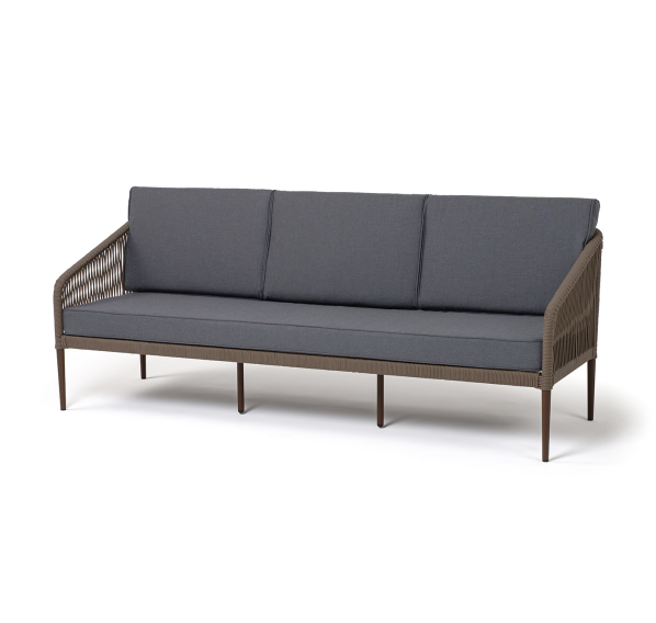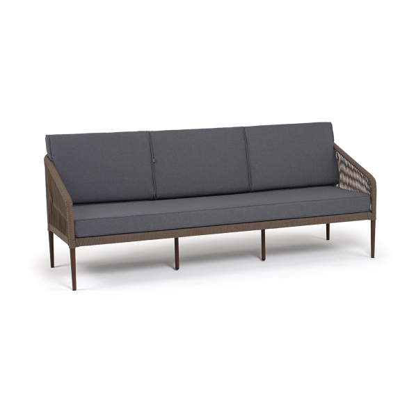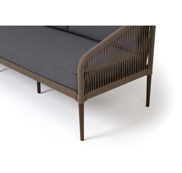Диван имеет алюминиевый каркас, окрашенный порошковой краской в коричневый (RAL8016) цвет. Боковины каркаса и спинка вручную оплетены роупом - эластичными синтетическими лентами, изготовленными из высокопрочных полиэфирных волокон. Цвет оплетки в тон каркасу - коричневый.