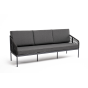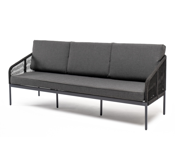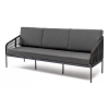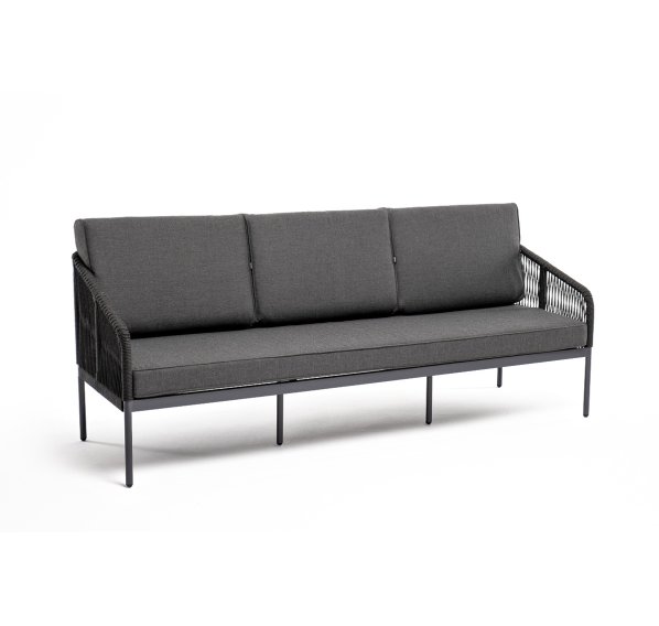 Диван имеет алюминиевый каркас, окрашенный порошковой краской в темно-серый (RAL7024) цвет. Боковины каркаса и спинка вручную оплетены роупом - эластичными синтетическими лентами, изготовленными из высокопрочных полиэфирных волокон. Цвет оплетки в тон каркасу - темно-серый.