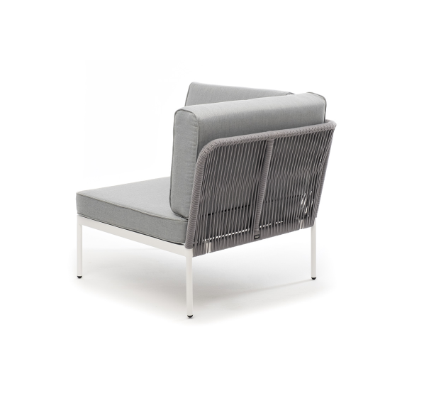 Плетеный модуль имеет алюминиевый каркас, окрашенный порошковой краской в белый цвет. Боковины каркаса вручную оплетены роупом - эластичными синтетическими лентами, изготовленными из высокопрочных полиэфирных волокон. Цвет оплетки - светло-серый.