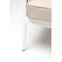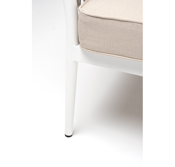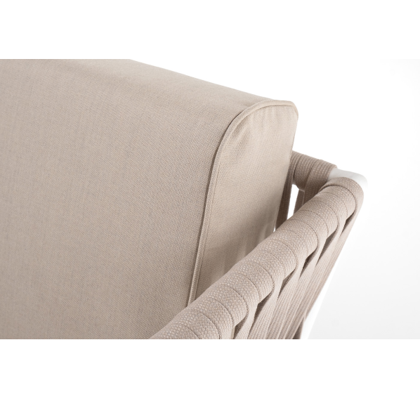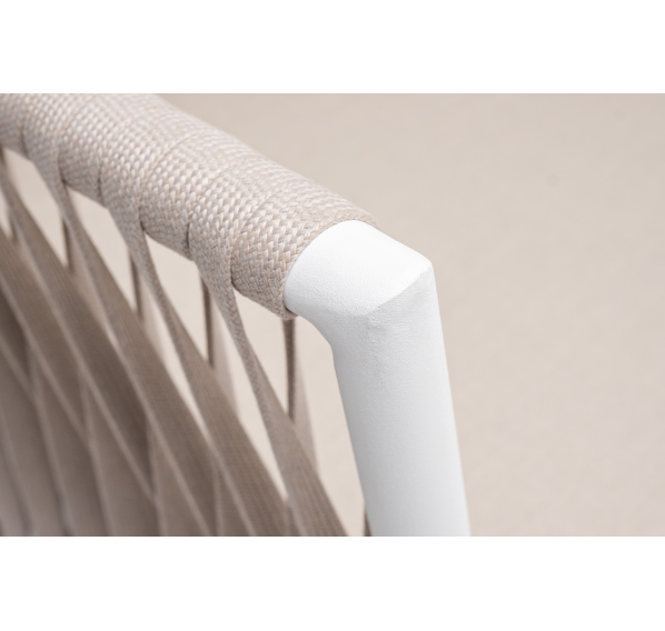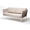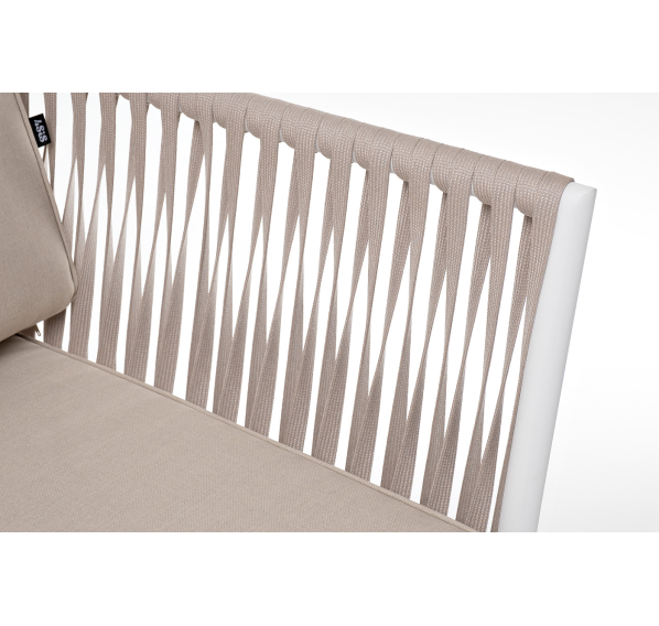 Диван имеет алюминиевый каркас, окрашенный порошковой краской в белый цвет. Боковины каркаса вручную оплетены роупом - эластичными синтетическими лентами, изготовленными из высокопрочных полиэфирных волокон. Цвет оплетки - бежевый.