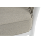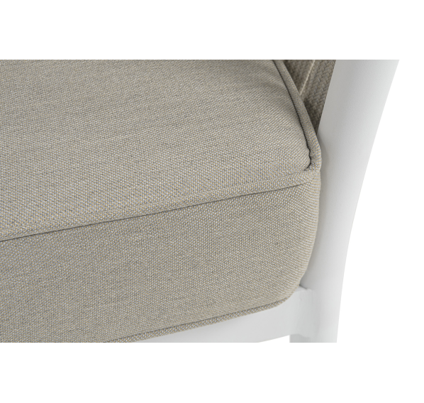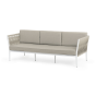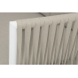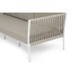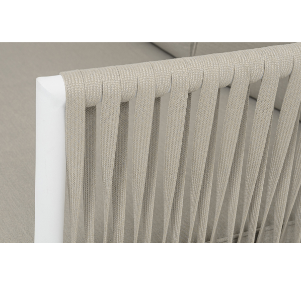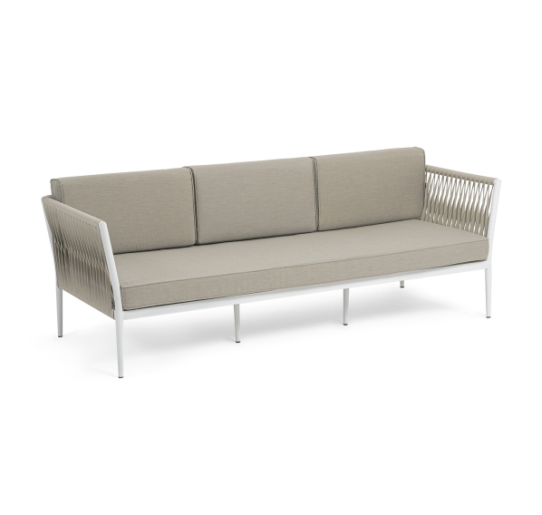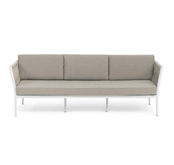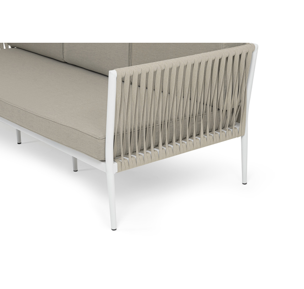 Диван имеет алюминиевый каркас, окрашенный порошковой краской в белый цвет. Боковины каркаса вручную оплетены роупом - эластичными синтетическими лентами, изготовленными из высокопрочных полиэфирных волокон. Цвет оплетки - бежевый.