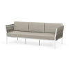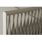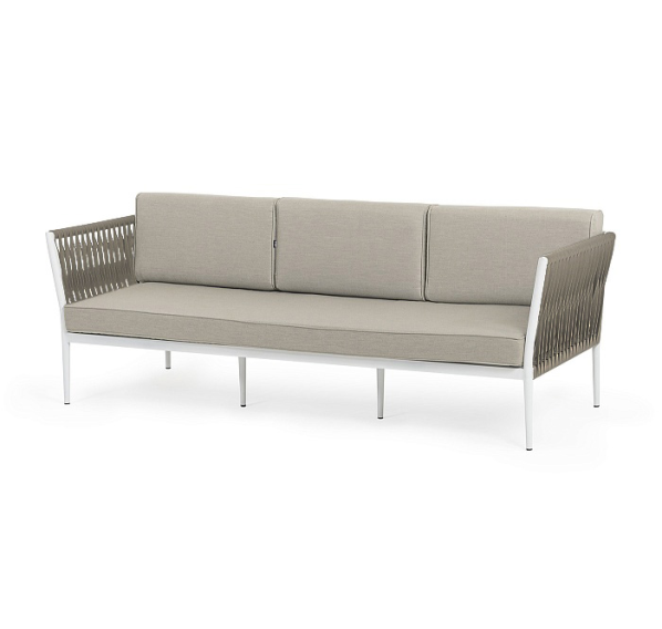 Диван имеет алюминиевый каркас, окрашенный порошковой краской в светло-серый (RAL7035) цвет. Боковины каркаса вручную оплетены роупом - эластичными синтетическими лентами, изготовленными из высокопрочных полиэфирных волокон. Цвет оплетки - серо-коричневый.