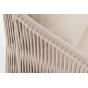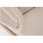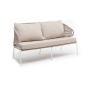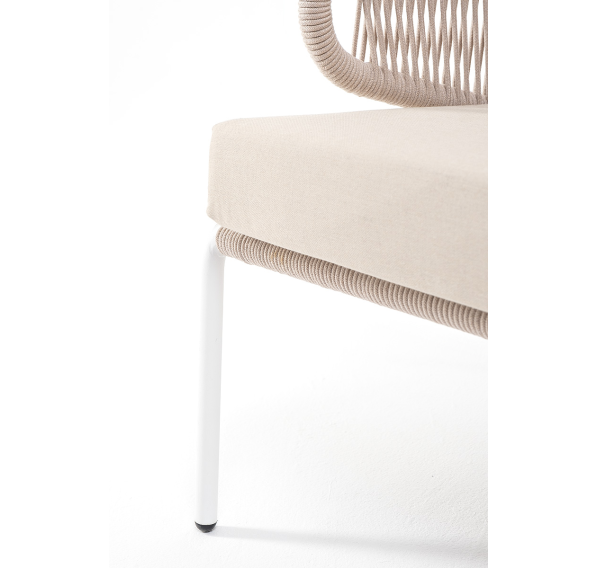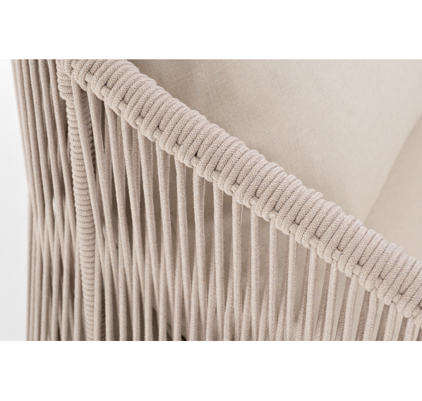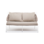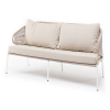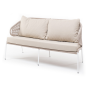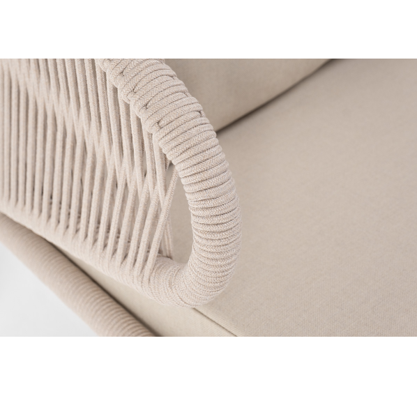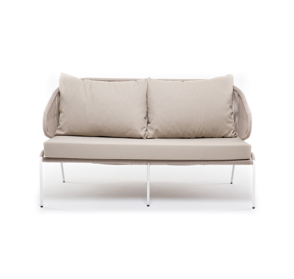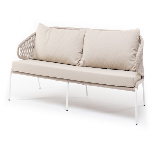 Диван имеет алюминиевый каркас, окрашенный порошковой краской в белый цвет. Боковины каркаса и спинка вручную оплетены роупом - эластичными синтетическими лентами, изготовленными из высокопрочных полиэфирных волокон. Цвет оплетки – бежевый.