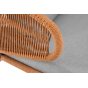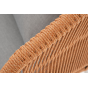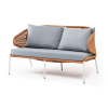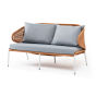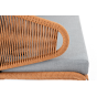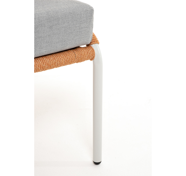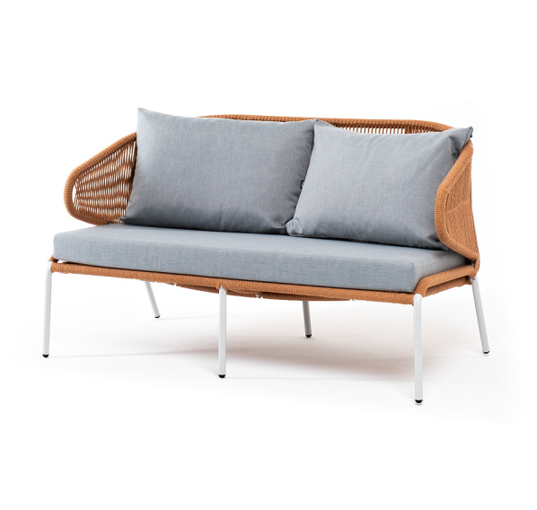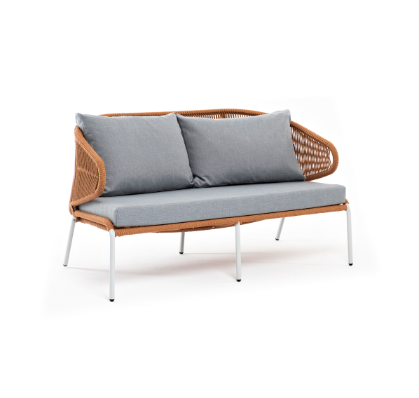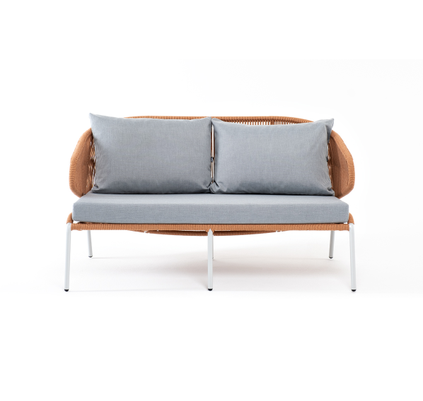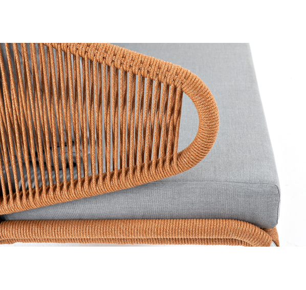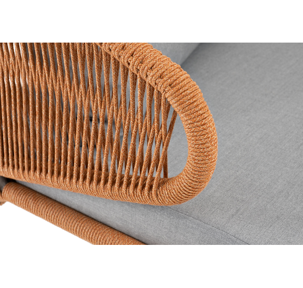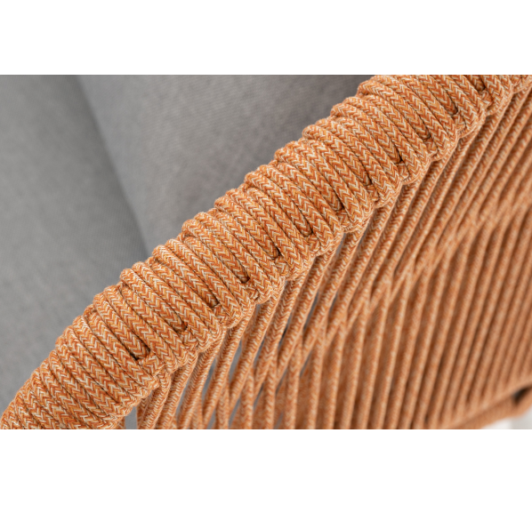Диван имеет алюминиевый каркас, окрашенный порошковой краской в светло-серый (RAL7035) цвет. Боковины каркаса и спинка вручную оплетены роупом - эластичными синтетическими лентами, изготовленными из высокопрочных полиэфирных волокон. Цвет оплетки – оранжевый меланж.