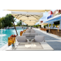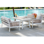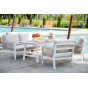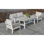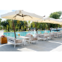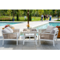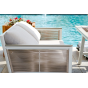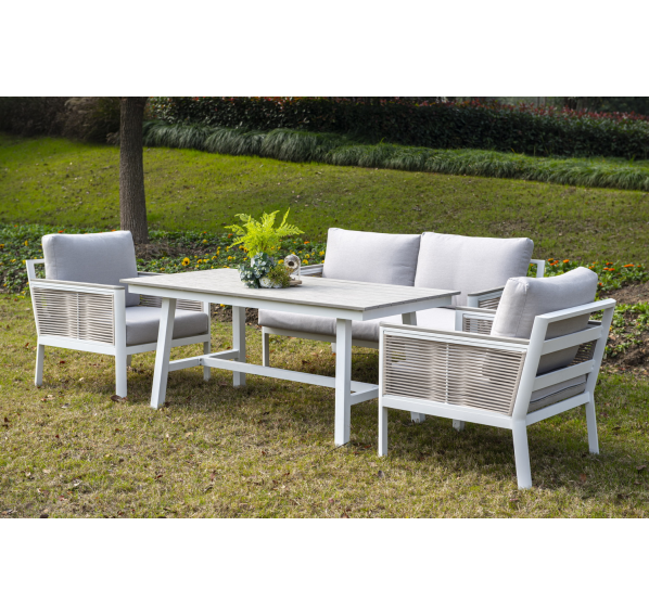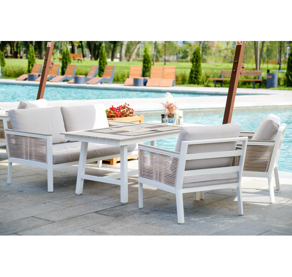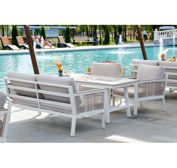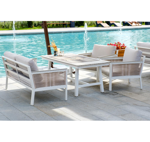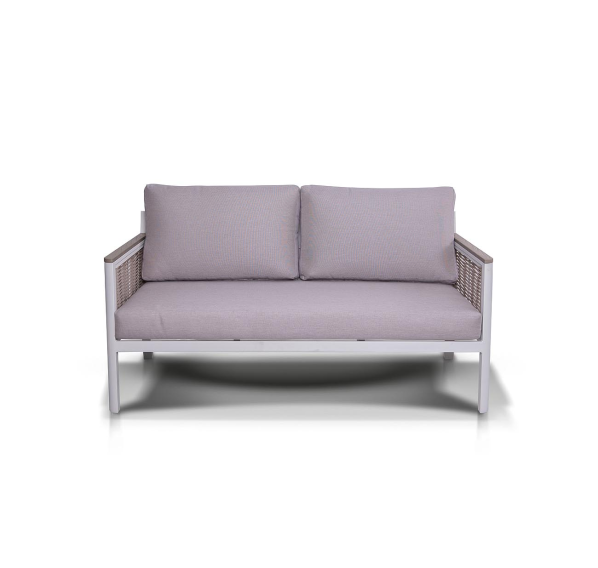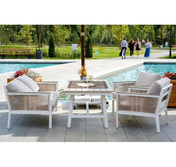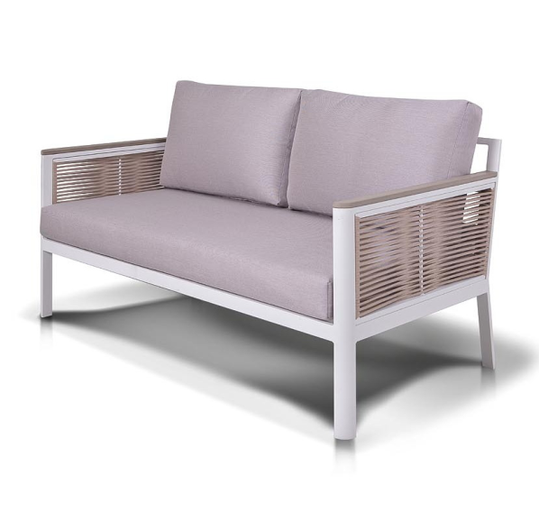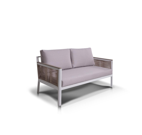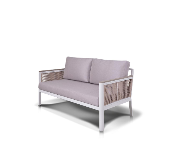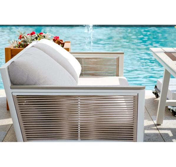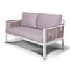Каркас выполнен из высококачественного алюминия и окрашен порошковой краской в белый цвет. Боковые стороны подлокотников вручную оплетены эластичными синтетическими лентами серо-коричневого оттенка, состоящие из высокопрочных полиэфирных волокон.