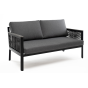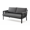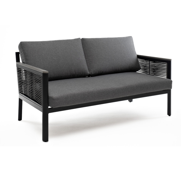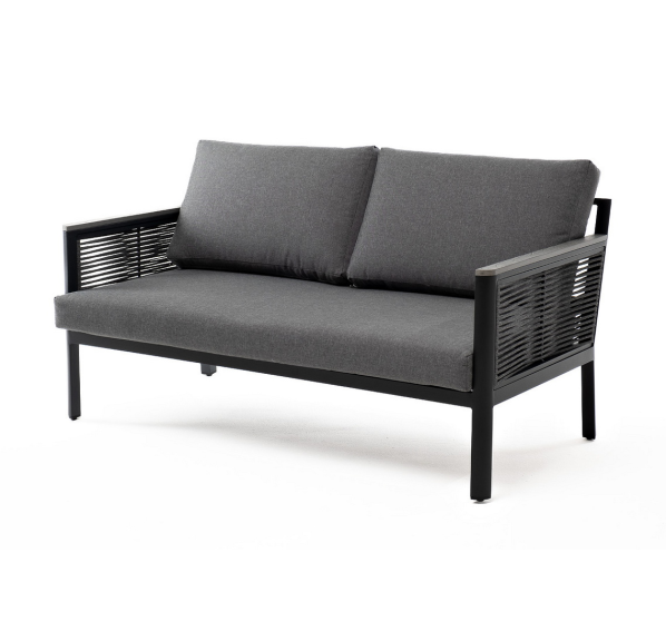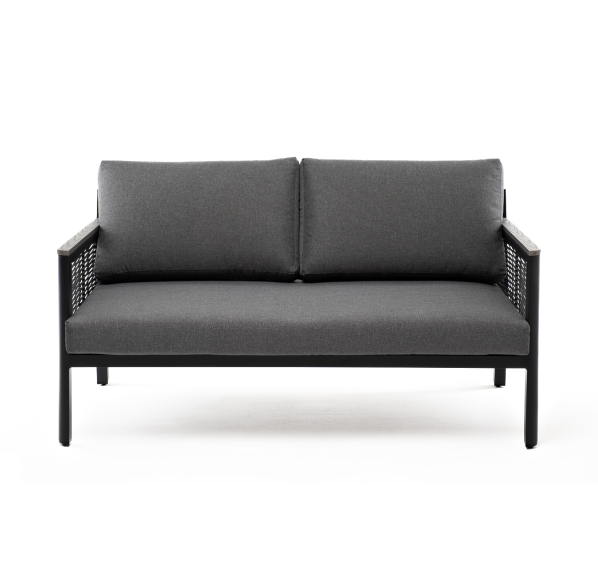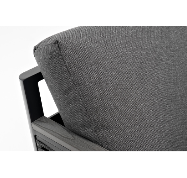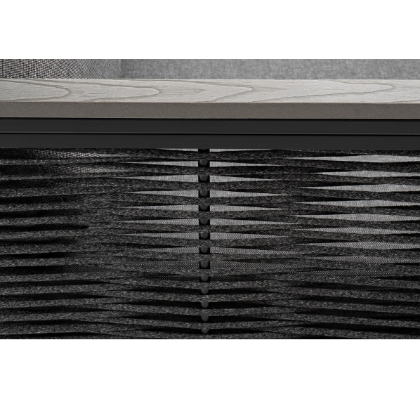 Каркас выполнен из высококачественного алюминия и окрашен порошковой краской в темно-серый цвет. Боковые стороны подлокотников вручную оплетены эластичными синтетическими лентами серого оттенка, состоящие из высокопрочных полиэфирных волокон.