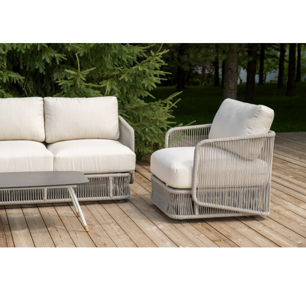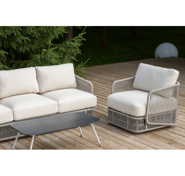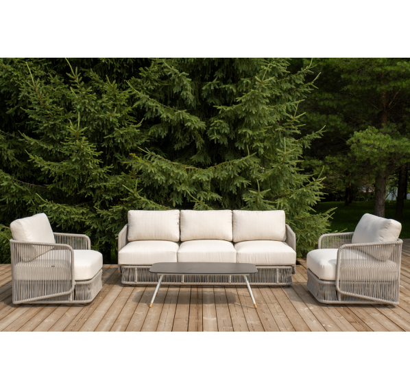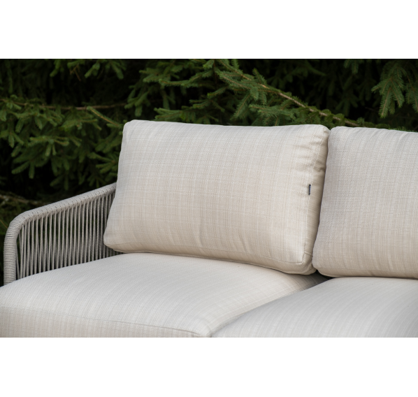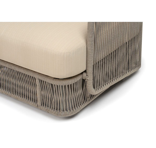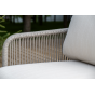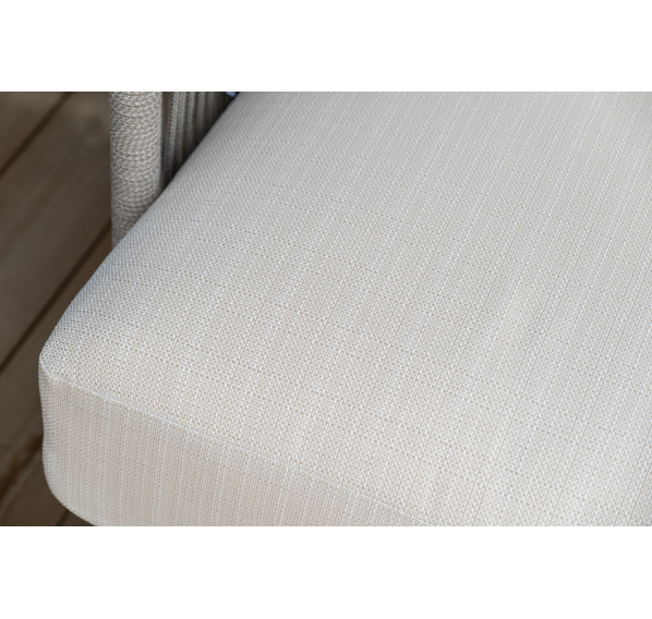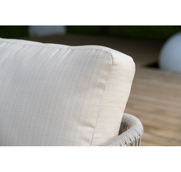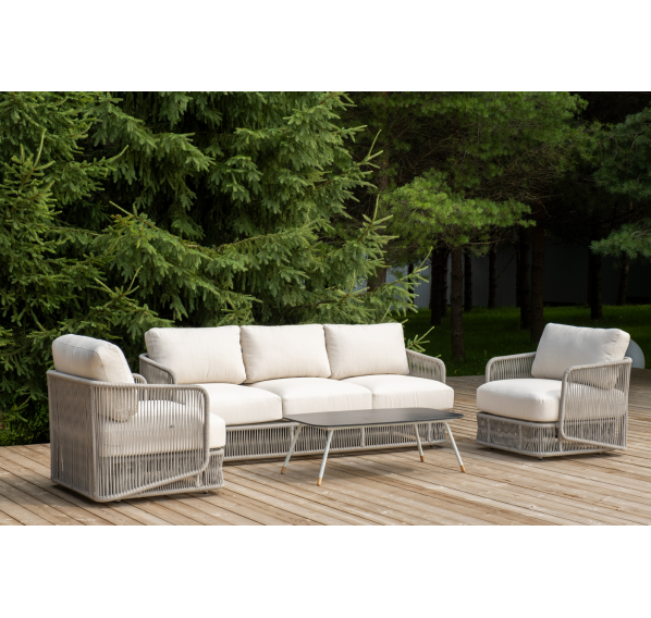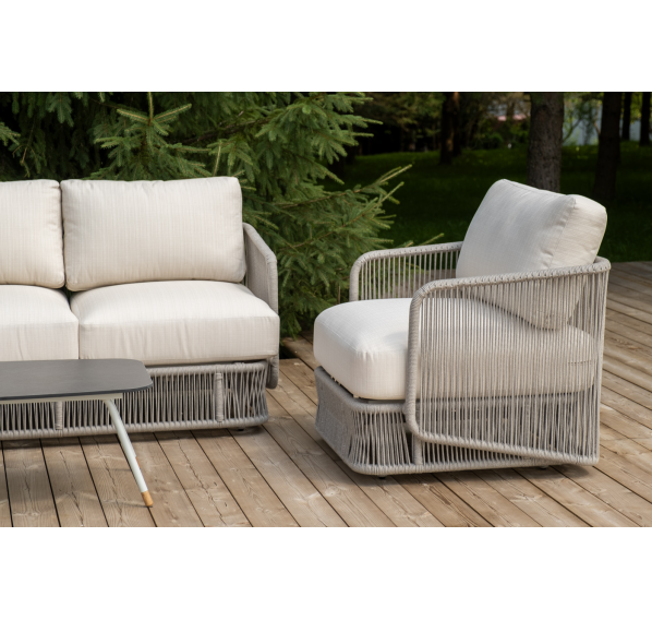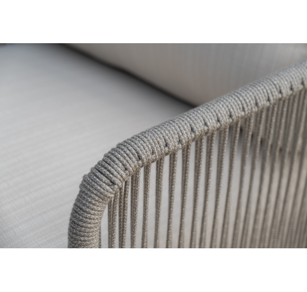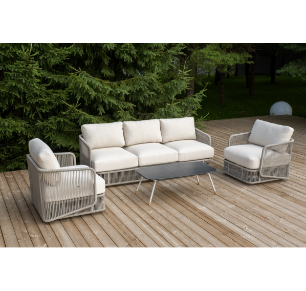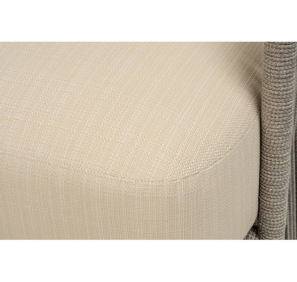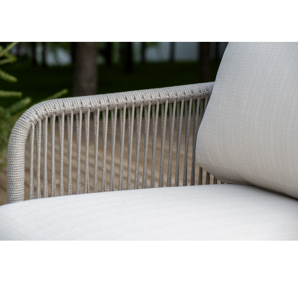 Каркас уличной мебели выполнен из износостойкого алюминия. Его дополняет бежевая ручная оплетка, изготовленная на основе эластичных синтетических лент из полиэфирных волокон высокой прочности (роупа).